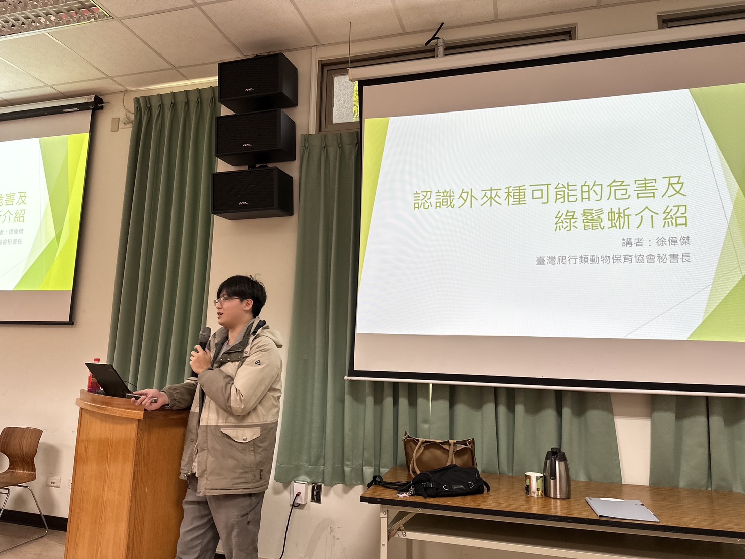 這次教育訓練特別邀請臺灣爬行類動物保育協會徐偉傑秘書長,除了講解外來入侵種危害、綠鬣蜥的棲息環境與生態習性,也介紹如何透過觀察農作物危害、綠鬣蜥移動痕跡以及繁殖洞穴,掌握綠鬣蜥出沒的蛛絲馬跡。期望讓同仁可以先行熟悉綠鬣蜥習性、配合活動與繁殖特性,以利後續移除作業順利進行。