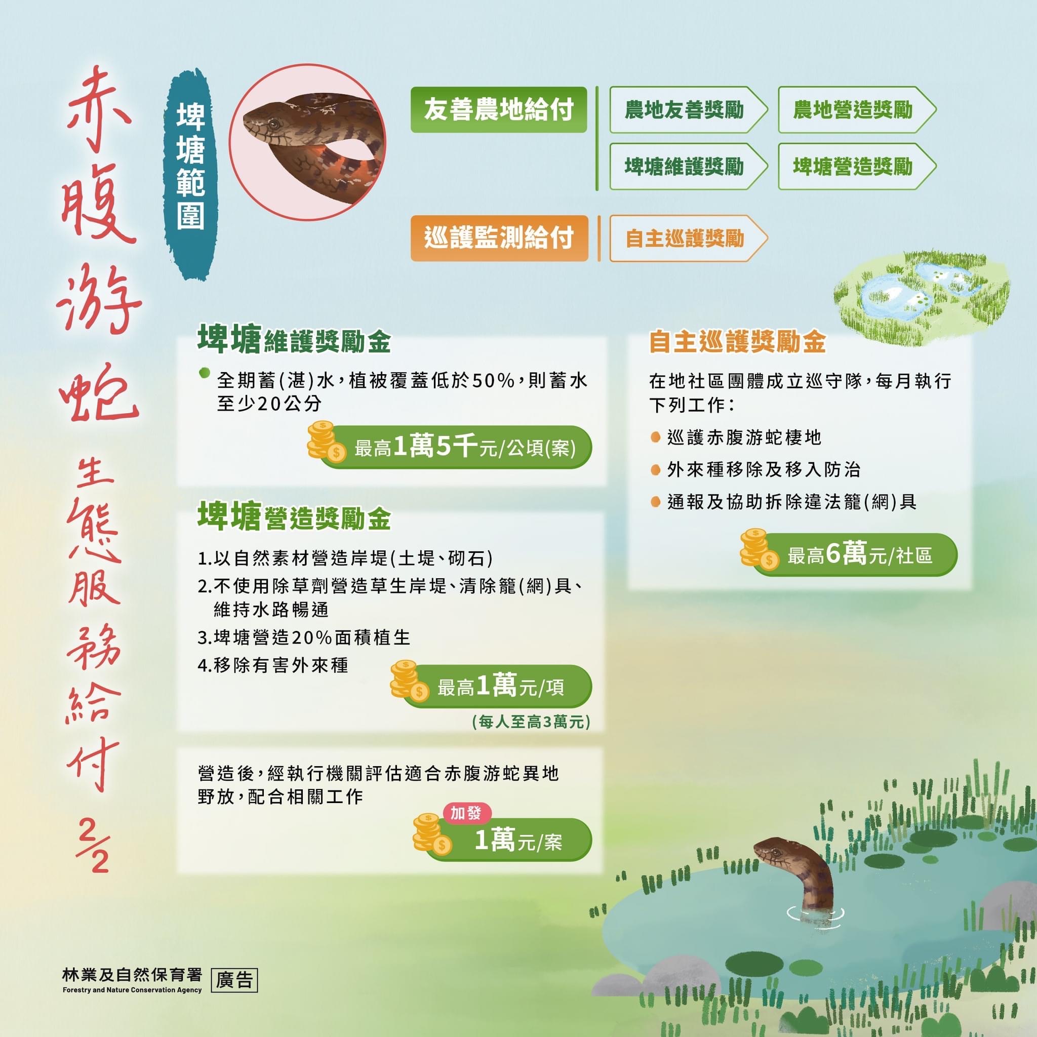 為推動生態保育與友善農業,林業及自然保育署新竹分署與慈心有機農業發展基金會將於114年3月5日(三)13:30至15:00,在桃園市龍潭區德龍國小活動中心舉辦「赤腹游蛇生態服務給付說明會」,歡迎居民自由參加。 赤腹游蛇為臺灣瀕臨絕種保育類野生動物,過去廣泛分布於西部低海拔的淺山與平原水域,如濕地、梯田、埤塘與魚塭。然而,受極端氣候、土地開發及現代農業影響,其棲地大幅減少,族群數量銳減。目前,野生族群僅存於陽明山與桃園龍潭周邊。林業保育署新竹分署透過推動「赤腹游蛇生態服務給付示範計畫」,以鼓勵友善環境行動。 「赤腹游蛇生態服務給付」範圍涵蓋桃園市龍潭區、楊梅區與大溪區,內容分為「友善農地給付」與「巡護監測給付」兩部分。透過生態服務給付機制,政府與居民攜手守護珍貴生態,確保赤腹游蛇族群穩定,促進生物多樣性。期待您的參與,共同為環境盡一份心力! 【活動資訊】 時間:114年3月5日(三)13:30 - 15:00 地點:桃園市龍潭區德龍國小活動中心 參加方式:自由入場 聯絡資訊 :慈心基金會,溫小姐02-7714-6077#30706 【友善農地給付】 鼓勵農民維持環境友善的農業行為,例如不使用除草劑及中高毒性農藥,保護農地的自然蓄水功能。符合條件的農民可每年獲得最高3萬元/公頃的獎勵,並在進行生態營造(如建造田埂、生態池或移除有害外來物種)時,額外獲得最高3萬元的營造獎勵。 【巡護監測給付】 鼓勵社區居民組織巡守隊,每月巡查赤腹游蛇的棲地狀況。巡守隊可獲得每年最高6萬元的獎勵金,以支持其巡護活動。