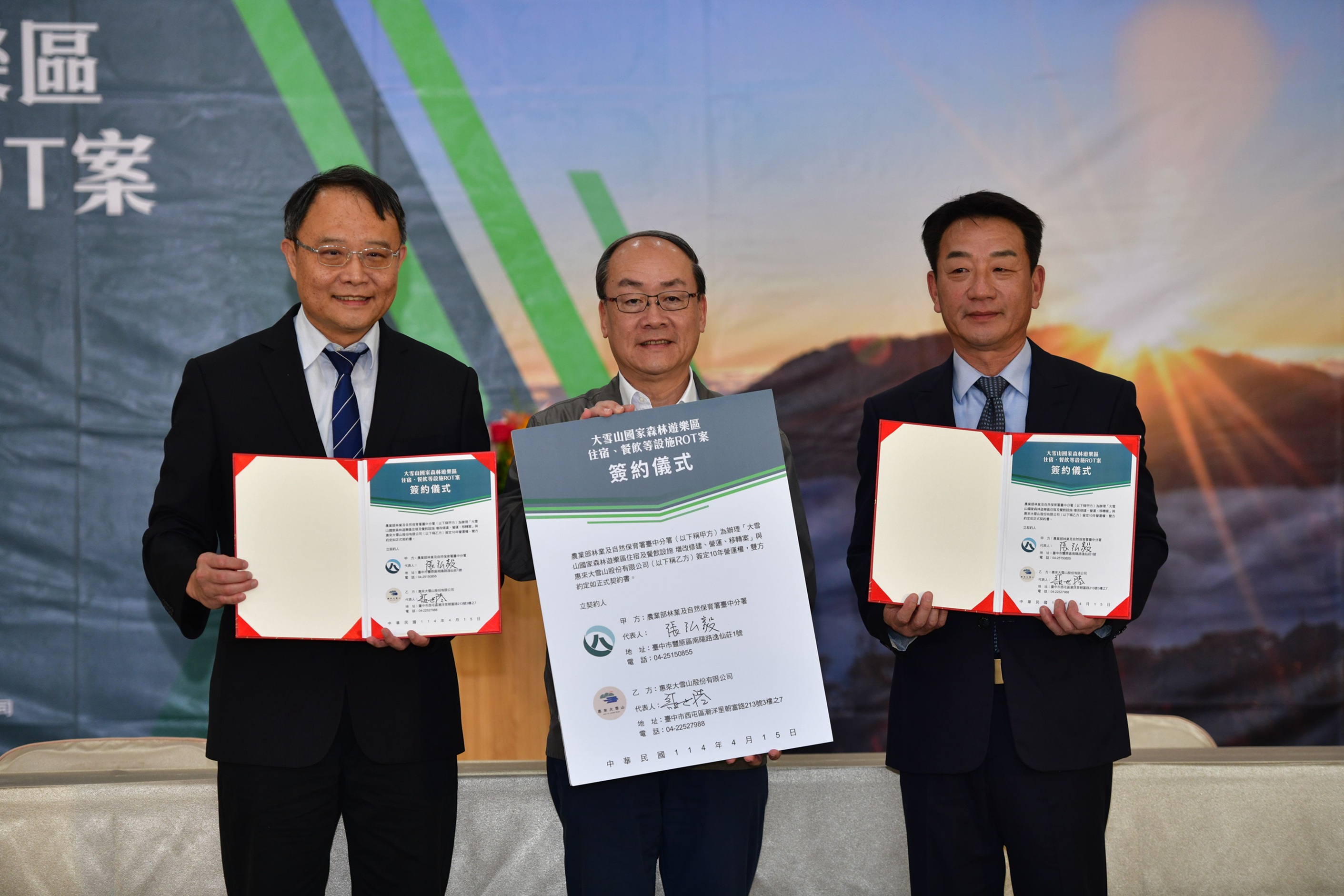 林業及自然保育署臺中分署與惠來企業旗下的惠來大雪山股份有限公司,今(15)日由張弘毅分署長與顏世陸董事長正式進行「大雪山國家森林遊樂區住宿餐飲等設施增改修建、營運移轉案」簽約儀式,委託營運10年,雙方將攜手推動大雪山國家森林遊樂區之觀光發展、低碳生態旅遊及環境教育等多元目標。