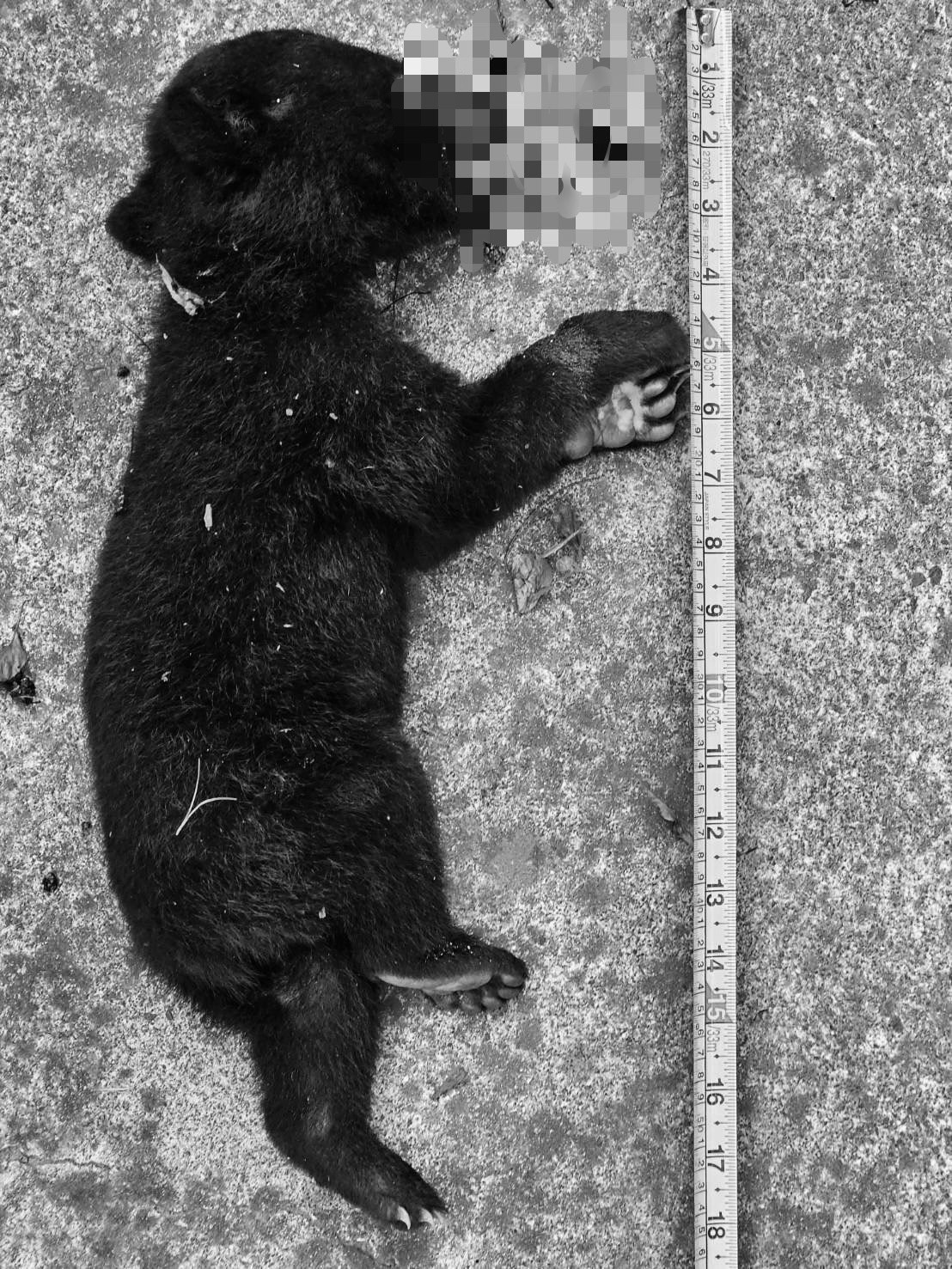 林業保育署臺東分署今(8)日下午4時許接獲臺東縣政府農業處轉知關山分局霧鹿派出所通報,有民眾報案於臺東縣海端鄉南橫公路霧鹿路段178.4公里,海拔高764公尺處,發現一隻已死亡之臺灣黑熊幼獸,臺東分署隨即由關山工作站派員前往會同現勘,確認該幼熊個體明顯死亡,為進一步瞭解死因,已於傍晚將遺體送達野灣野生動物醫院。