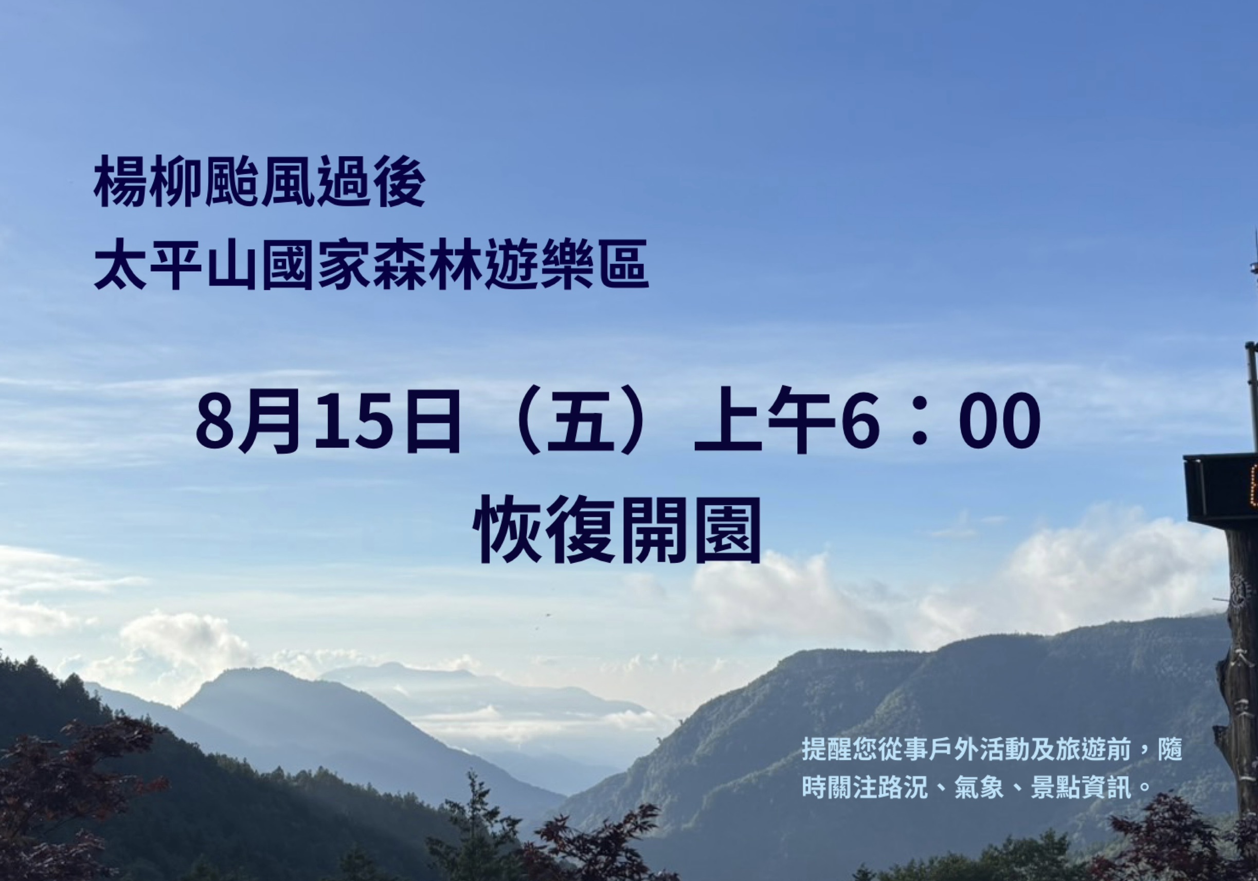 楊柳颱風過後,太平山國家森林遊樂區經現場勘查及進行區內環境與各項設施巡視整備,訂於114年8月15日(五)上午6:00起恢復開園,另提醒區內各場域管制開放狀態如後:宜專一線7K維持單線雙向通行(紅綠燈管制),蹦蹦車局部復駛至一公里處,茂興懷舊步道暫停開放,見晴懷古步道局部開放至750M,翠峰湖環山步道局部開放步道西口→1.1K景觀平臺、步道東口→3.6K觀湖平臺。 林業及自然保育署宜蘭分署提醒民眾從事戶外活動請隨時關注公路局網站訊息(https://www.thb.gov.tw/),也需查詢氣象資料,以維旅遊安全。太平山相關訊息可上官網 (http://tps.forest.gov.tw) 、台灣山林悠遊網(http://recreation.forest.gov.tw/)及FB粉專(http://www.facebook.com/tps100.forest/)查詢。