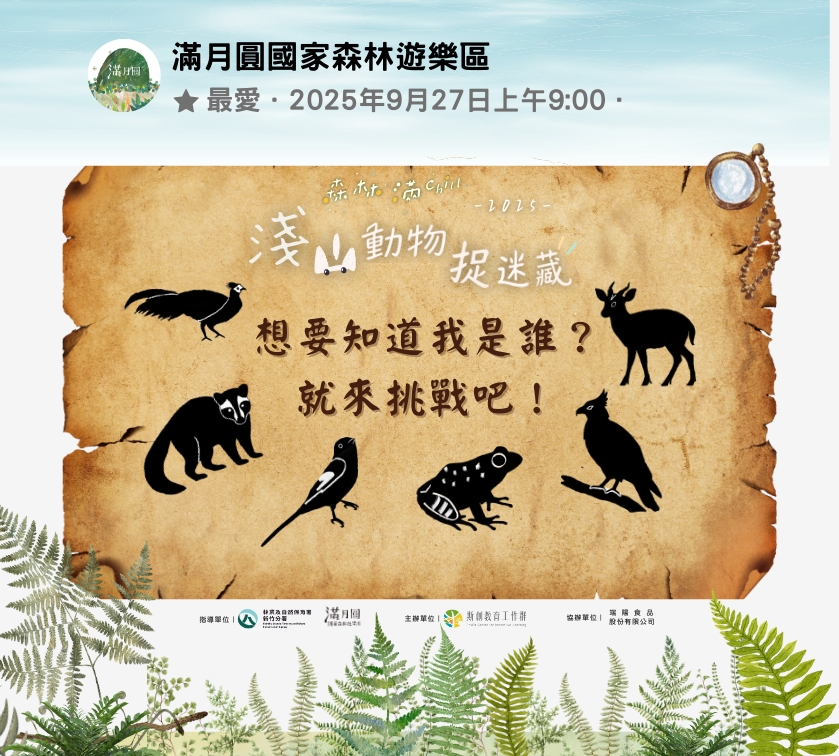 中秋佳節前夕,滿月圓國家森林遊樂區年度活動【森林滿Chill】將於9月27日(星期六)上午9點至下午4點登場。林業及自然保育署新竹分署今年規劃以「淺山動物捉迷藏」為主題,六大特色活動將在園區同步登場,包括「達人導覽 × 森林闖關」、「臺灣動物森友會」、「森林野餐市集」、「森林手作」、「山之聲音樂會」及「線上同樂Chill」,讓遊客能在寓教於樂中認識自然,體驗「說走就走、隨興漫遊」的旅遊魅力。 本次活動最受矚目的亮點,是探索森林、解密淺山動物的「達人導覽×森林闖關」。遊客甫一入園即可在入口迎賓區領取闖關卡,沿著步道挑戰任務並聆聽森林志工的精彩解說,深入認識滿月圓的淺山動物,完成闖關指定任務,還可兌換限定版滿月圓淺山生態專屬小禮。當天在遊客中心周邊也將舉辦「臺灣動物森友會」,由城市狸貓回報網、台灣兩棲動物保育協會、台灣猛禽研究會、羽林生態有限公司等自然保育團體帶來趣味互動,邀請民眾一同加入守護生態的行列。 活動當天亦邀請三峽在地的友善環境餐飲團隊共同推出「森林野餐市集」,包括強調健康天然的五寮尖山羊奶、主打古早味飲品與手工甜品的祥興茶行,以及秉持「安心好食材,用心做麵包」理念的Rookie Bagel。現場並推出限量野餐墊,邀請民眾在林間野餐區享受愜意Chill的野餐時光,用行動支持人與自然共生的生活方式。 融入自然的五感體驗是觸碰森林的最佳途徑,滿月圓遊客中心提供森林油畫、香錐揉製、原木杯墊等「森林手作」活動,以及森林小舖的「山之聲音樂會」,讓遊客在視、聽、嗅、觸覺的饗宴中放鬆身心,帶走最美好的森林記憶。加碼完成社群活動「線上同樂Chill」,還有機會獲得更多驚喜好禮。 以「淺山動物捉迷藏」為主題的2025年【森林滿Chill】滿月圓年度活動將於9月27日(六)上午9點至下午4點舉行,遊樂區維持上午7點起開放入園。更多活動詳情,請上林業及自然保育署新竹分署「滿月圓國家森林遊樂區」臉書粉絲專頁查詢,或電洽遊客中心(02-2672-0542,服務時間每日08:30至17:00,週二休館)。