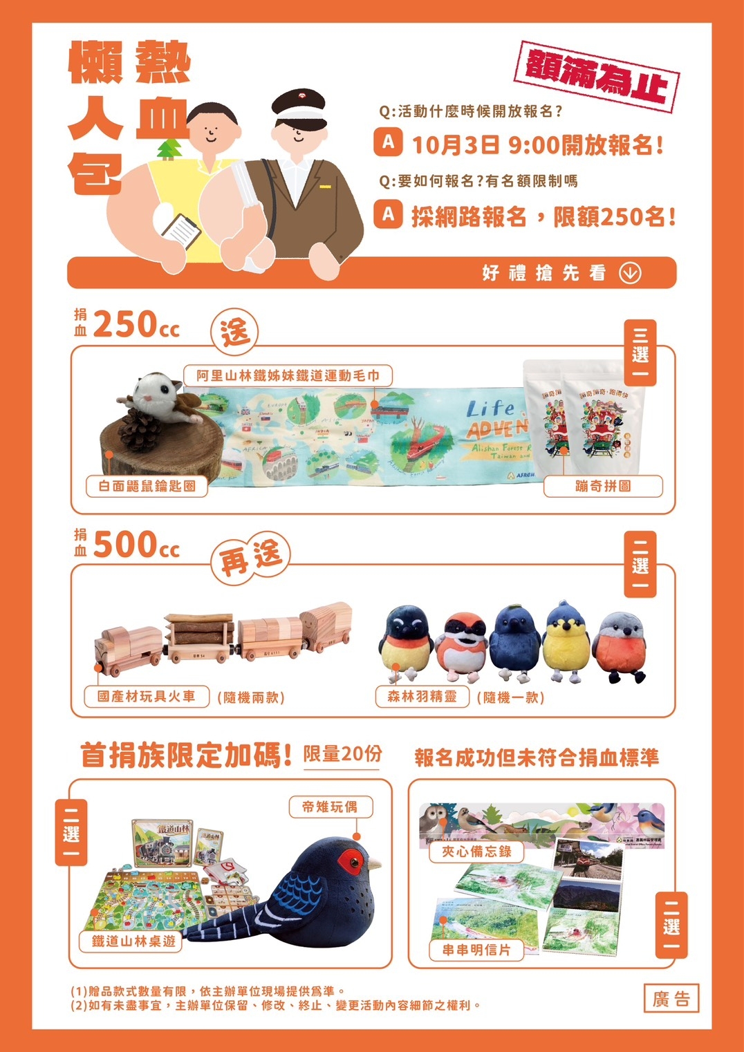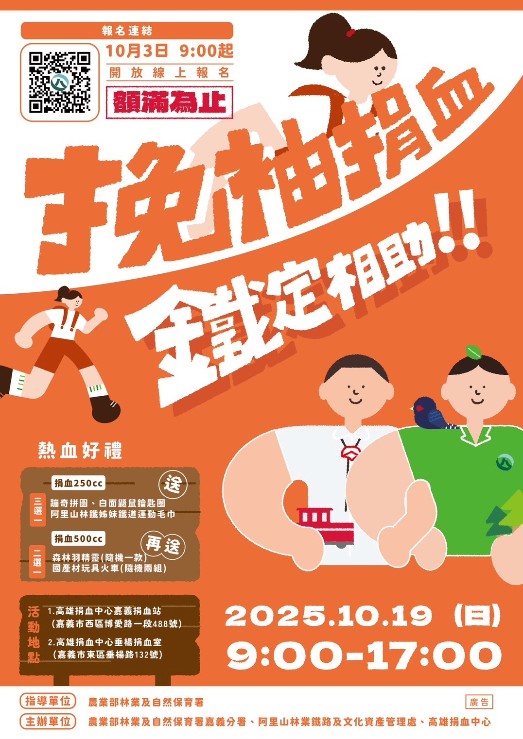 為鼓勵民眾踴躍捐血作公益,農業部林業及自然保育署嘉義分署與阿里山林業鐵路及文化資產管理處攜手合作,將於114年 10 月 19 日(星期日)上午 9 時至下午 5 時同步於高雄捐血中心嘉義捐血站與垂楊捐血室舉辦「挽袖捐血 鐵定相助」捐血活動,現場備有森林羽精靈布偶、國產材玩具火車等多項文創商品要送給熱血民眾。活動採事前線上報名,限額250位,報名網址將於114年10月3日(星期五)上午9時整開放,歡迎民眾一起響應捐血,以實際行動將愛延續。 林業Ⅹ鐵道:公益能量雙重守護 林業保育署嘉義分署長期推動森林保育、環境教育與生態永續,林鐵處則守護阿里山百年鐵道與文化資產,此次捐血活動由兩機關聯手,將公益與林業保育、鐵道文化連結,象徵「森林需要永續,生命也需要延續」。嘉義分署與林鐵處共同表示,誠摯邀請民眾踴躍報名參加,一袋熱血,不僅守護病患生命,也象徵對森林與鐵道永續守護的支持,一起讓愛與希望持續在社會川流不息。 熱血參與 首捐好禮加倍送 本次捐血活動限額250名,凡報名成功且當日完成捐血的民眾即可獲得特色好禮。捐血250 CC的民眾可獲得「白面鼯鼠鑰匙圈」、「阿里山林鐵姊妹鐵道運動毛巾」或「蹦奇拼圖」三選一;捐血500 CC者可再獲得「國產材玩具火車」或「森林羽精靈造型玩偶」二選一。為鼓勵更多人勇敢跨出熱血公益的腳步,針對第一次挽袖捐血的民眾,嘉義分署與林鐵處更限量加碼,前20名首捐族可獲得好禮「鐵道山林桌遊」或「帝雉玩偶」二選一。 民眾如對活動有任何問題,歡迎洽詢嘉義分署05-2787006#111江先生或林鐵處05-2779843#157吳小姐