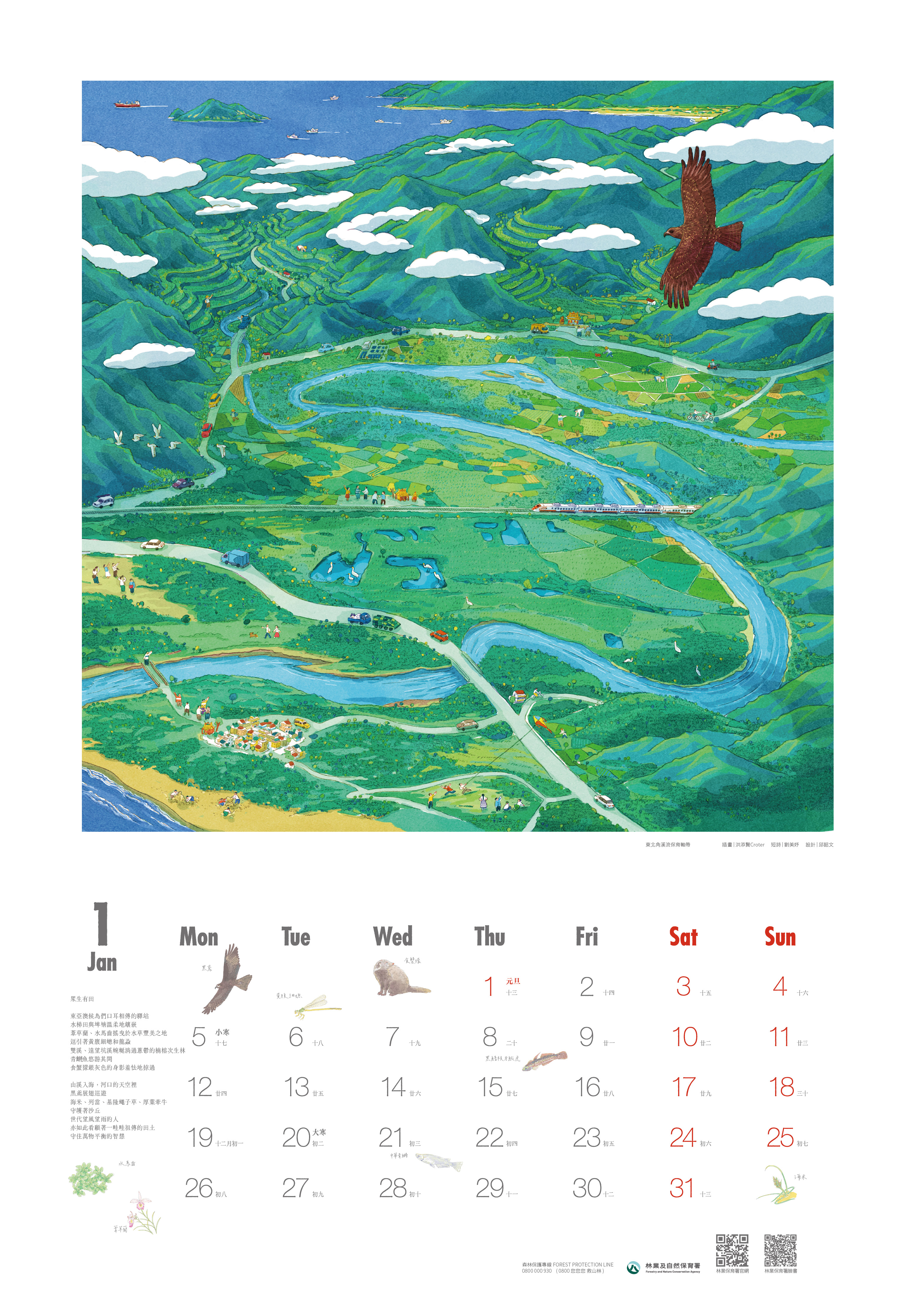 1月份「眾生有田」邀請知名插畫家洪添賢Croter,以黑鳶的視角描繪東北角雙溪流域的壯麗景觀。從遠處的貢寮水梯田到近景的田寮洋濕地,展現水源涵養與物種棲息的重要生態系,守護人與自然的和諧共存,營造純淨的生態淨土。