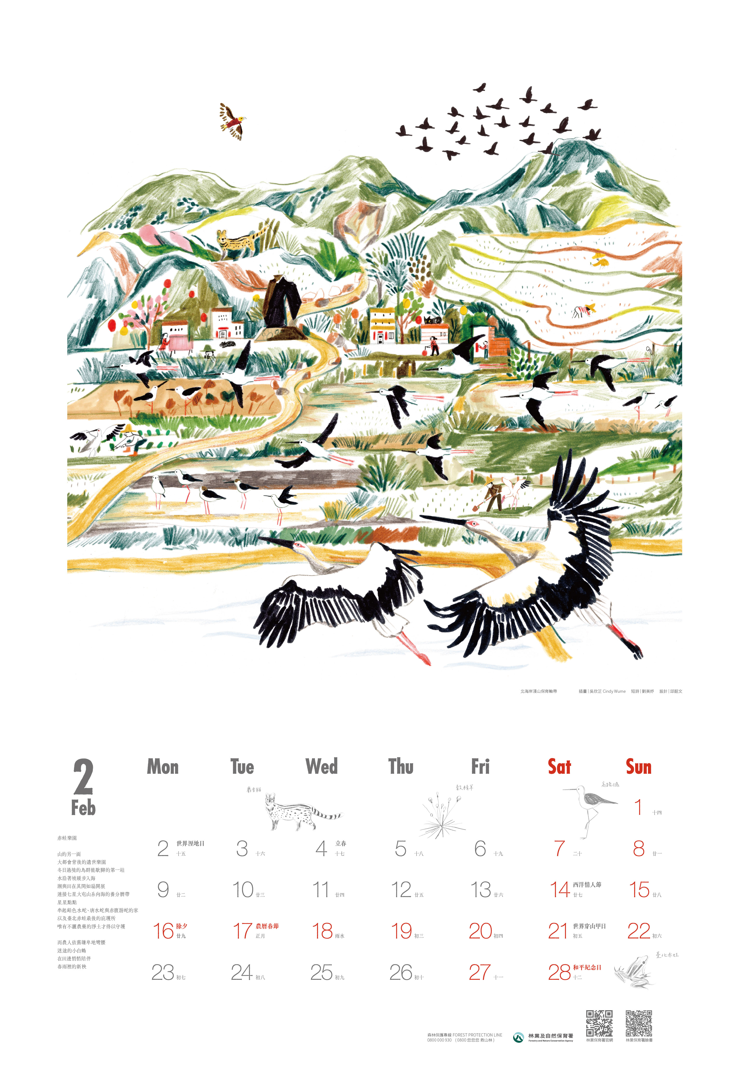 2月份「赤蛙樂園」由曾榮獲義大利波隆那插畫大獎的吳欣芷Cindy Wume繪製。她以筆觸展現北海岸金山清水濕地,遠眺七星山的壯闊景色。畫中大量候鳥遷徙經過,熱鬧的聚落懸掛著彩燈,洋溢著節日的喜悅氛圍。角落記錄著小鶴曾造訪金山,喚醒大家對友善耕作的重視,構圖兼具敘事性與親和力,充分展現繪本藝術的故事韻味。