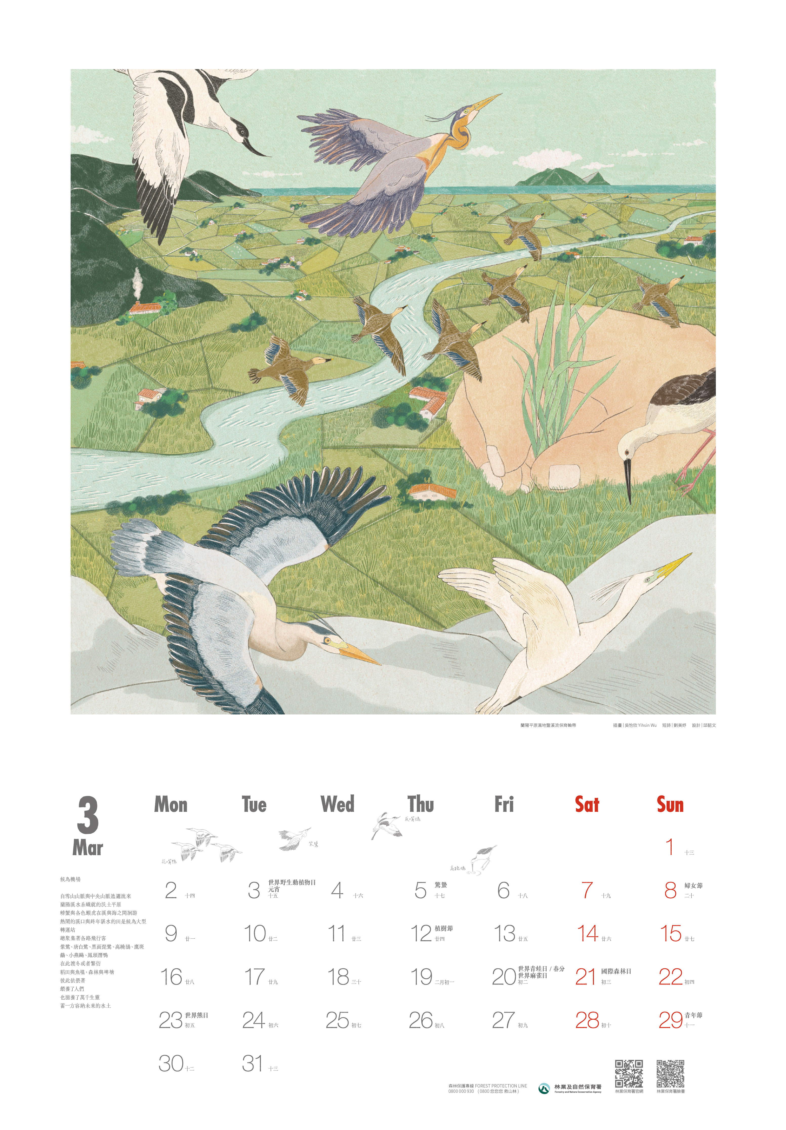 3月份「候鳥機場」是吳怡欣Yihsin Wu透過插秧的手,展現蘭陽平原與蘭陽溪孕育生命的奇蹟。同時,3月也是冬侯鳥北返的季節,畫面猶如空中機場,蒼鷺、紫鷺、唐白鷺、高蹺鴴等候鳥陸續啟程,踏上歸巢繁殖的旅途,象徵自然生態的永續循環。