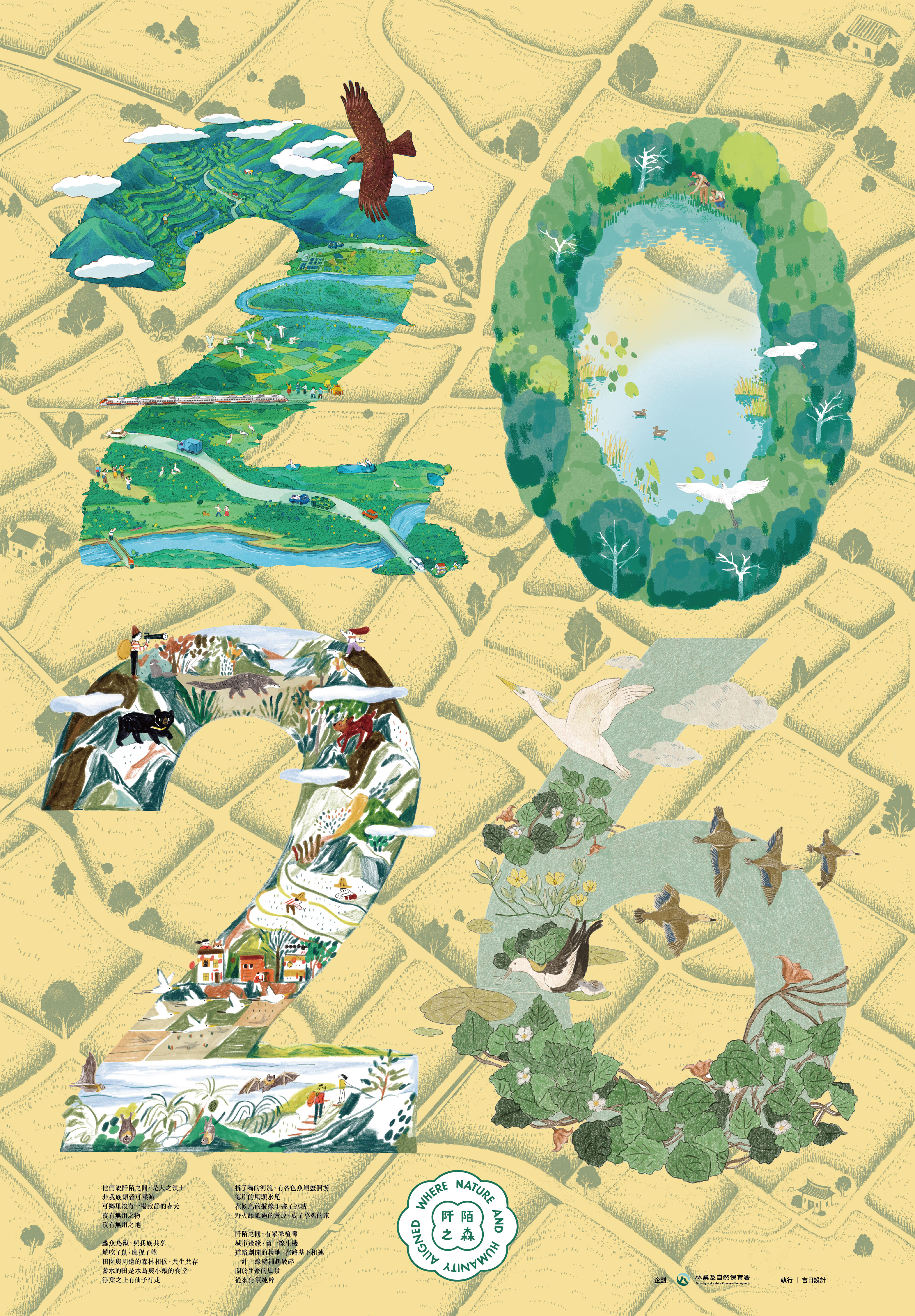 跟著五位繪師的創意視角,想像自己從鬱閉的森林探出頭,穿過剛收割的農地、越過溪流淺灘,縱橫在阡陌之間自在棲存。可以從空中鳥瞰到溪流中仰視,也能從海平面眺望到田野間穿行,一場跨越空間的觀景之旅即將展開,引領大家一同俯瞰國土生態綠網串起的阡陌地景與里山里海多元生態。