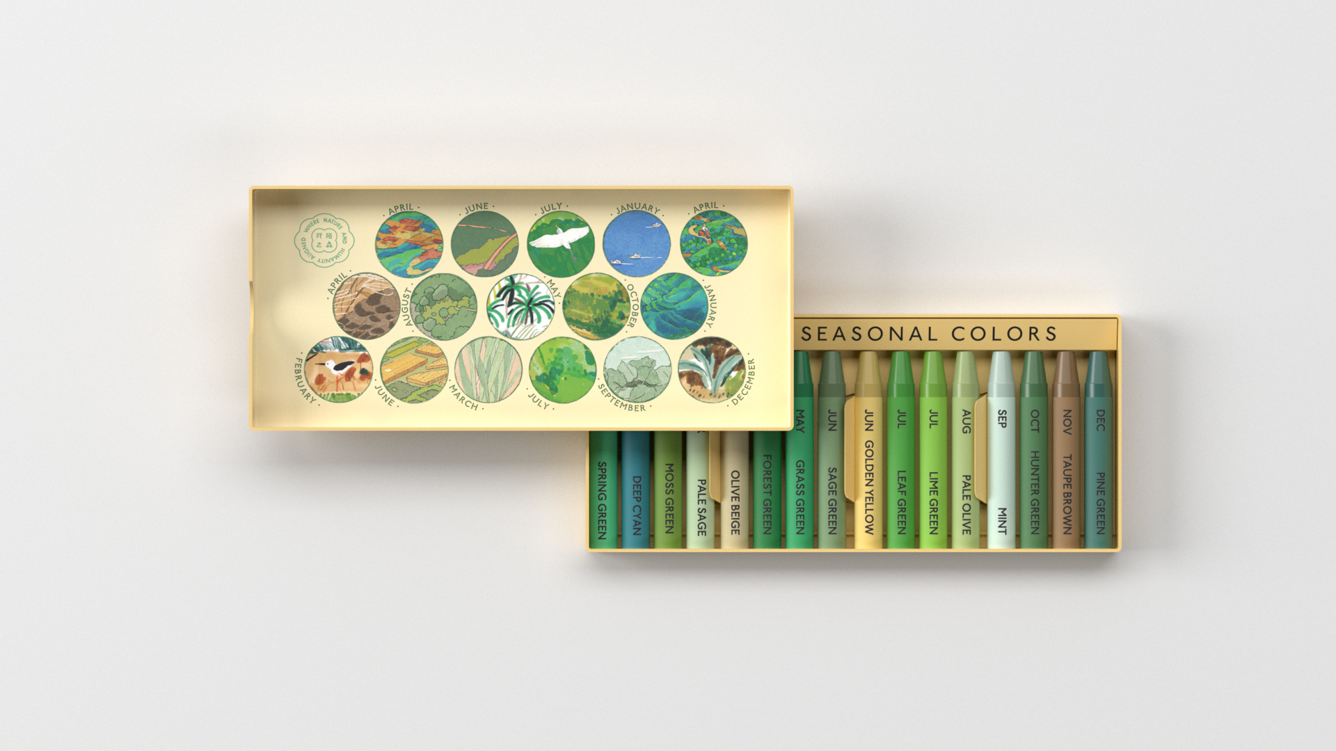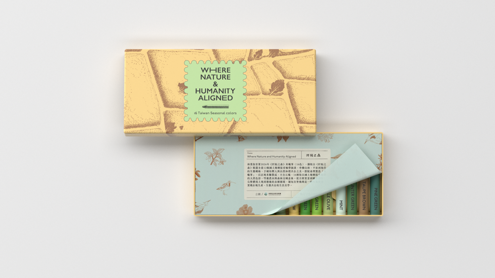 《阡陌之森》月曆長75公分、寬52公分,使用FSC認證紙張印製,每份定價新臺幣380元;桌曆則採卡片式設計,並包裝設計成三角桌曆檯座,兼顧美觀與實用,每份定價新臺幣360元;米蠟筆16色天然色彩,擷取自《阡陌之森》精選全臺12條國土綠網保育軸帶插畫,搭配臺灣製造「米蠟筆」,以在地米糠製成,不含石蠟,呼應農田與森林交織意象,每份定價新臺幣360元。