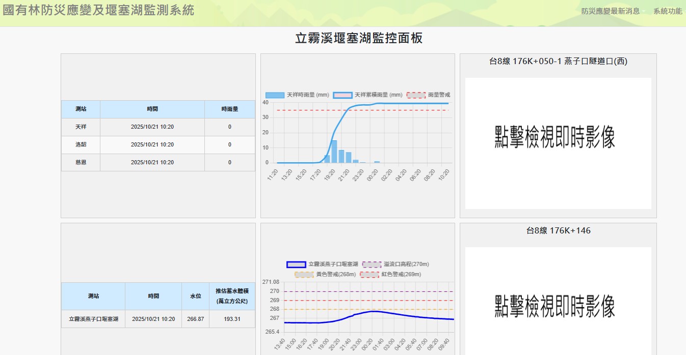 三、昨(10/20)日已由成大防災研究中心協助完成湖區水位計架設,並於下午6時許完成監控面板系統開發上線,整合中央氣象署雨量站之時雨量列表,可觀看過去24小時之降雨情形;水位觀測站之水位、蓄水體積列表,可觀看過去24小時水位變化;公路局東分局設置於台8線之CCTV即時影像,可分別觀看隧道溢流口與堰塞湖天然堆積壩體之現況,有效提升監測及警戒效率。