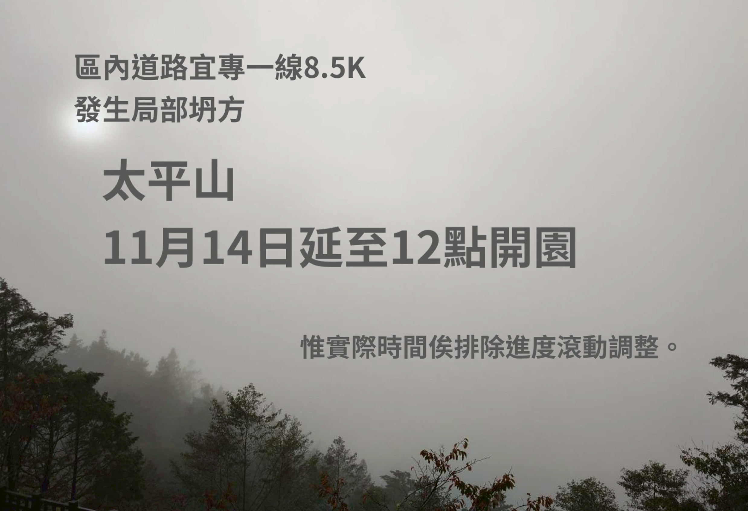 太平山區內道路發生坍塌 11月14日 延後至12點開園