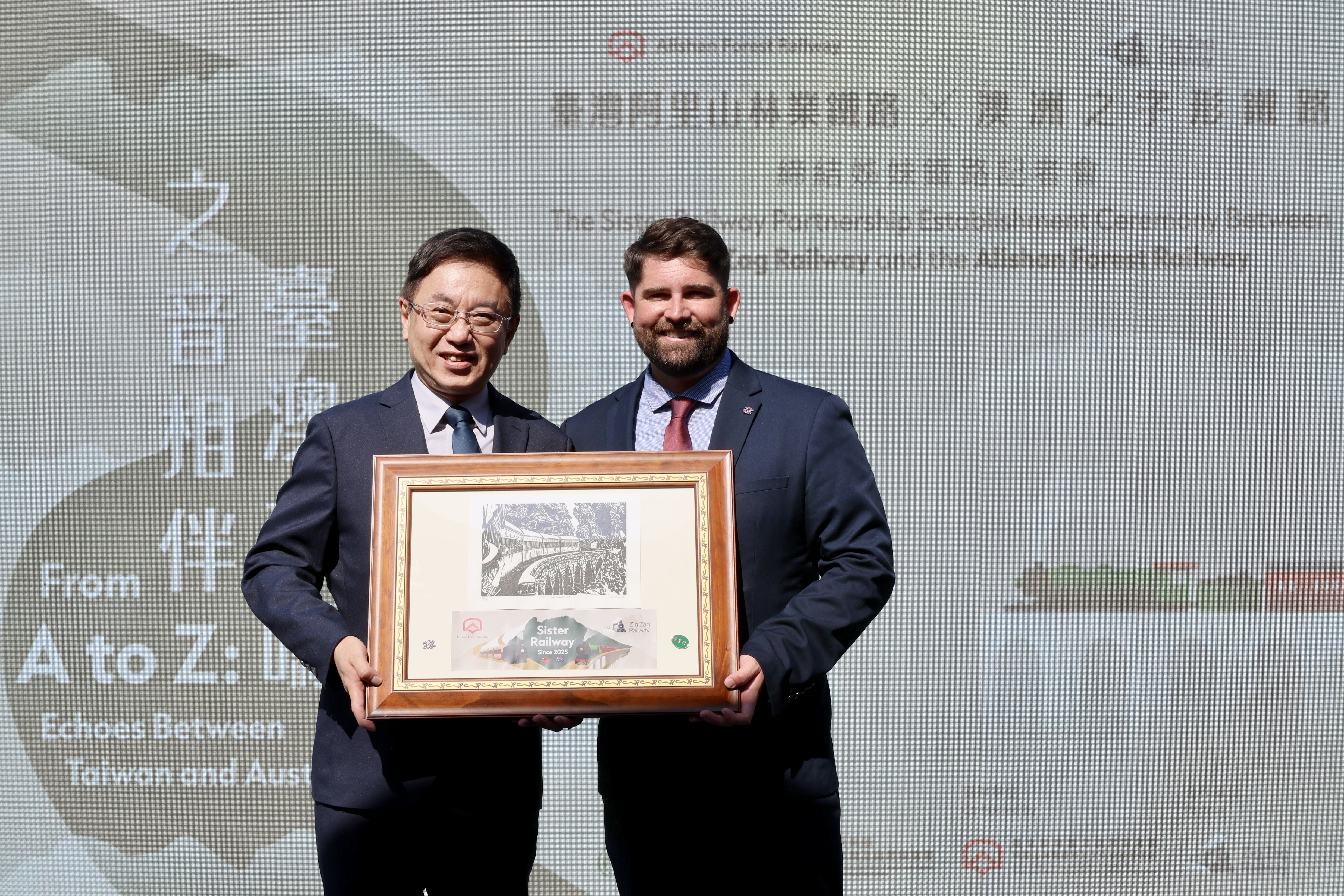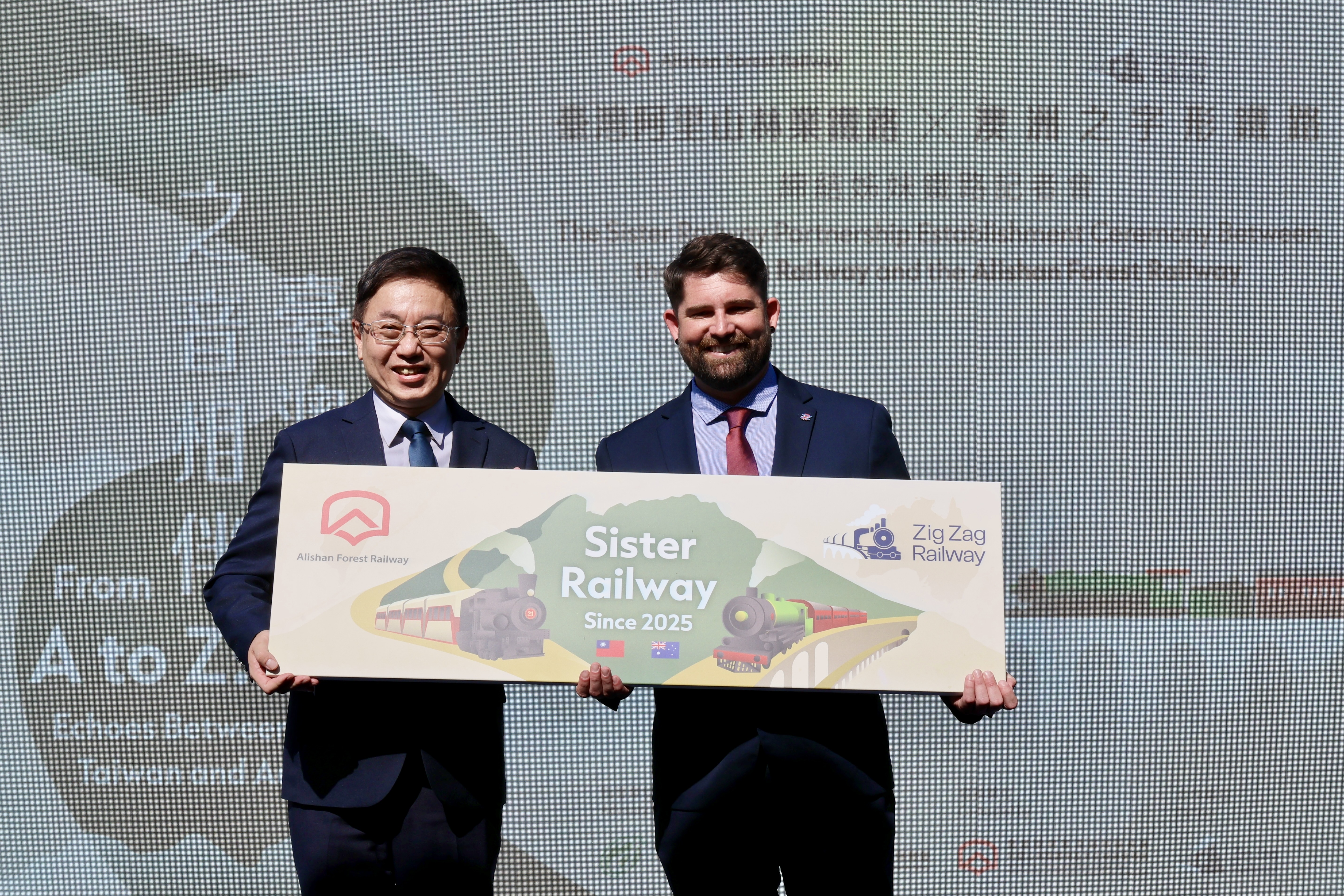 阿里山林業鐵路與澳洲新南威爾斯州的之字形鐵路(Zig Zag Railway),兩條同以「之」字形路線聞名的百年產業鐵路,今(9)日在阿里山林鐵北門驛締結為姊妹鐵路,不僅見證了臺澳雙方以智慧克服地形限制、與山林共生的精神,更是將阿里山林業鐵路的國際合作網絡首度擴展至大洋洲,為全球遺產鐵路保存與永續樹立新里程碑。