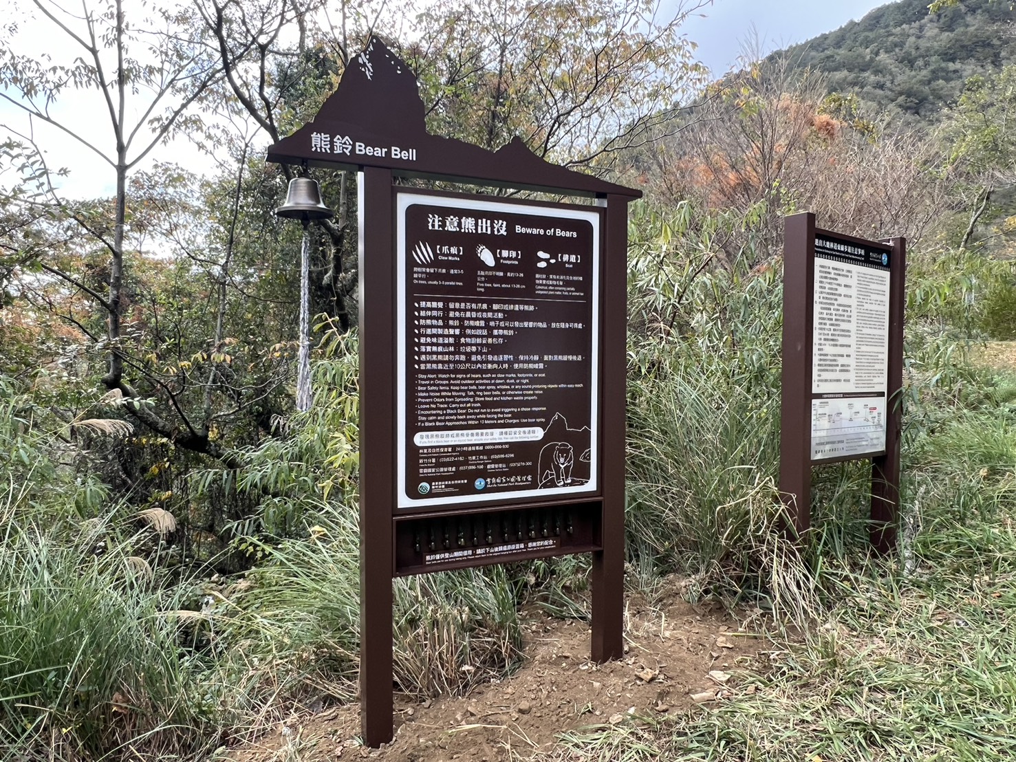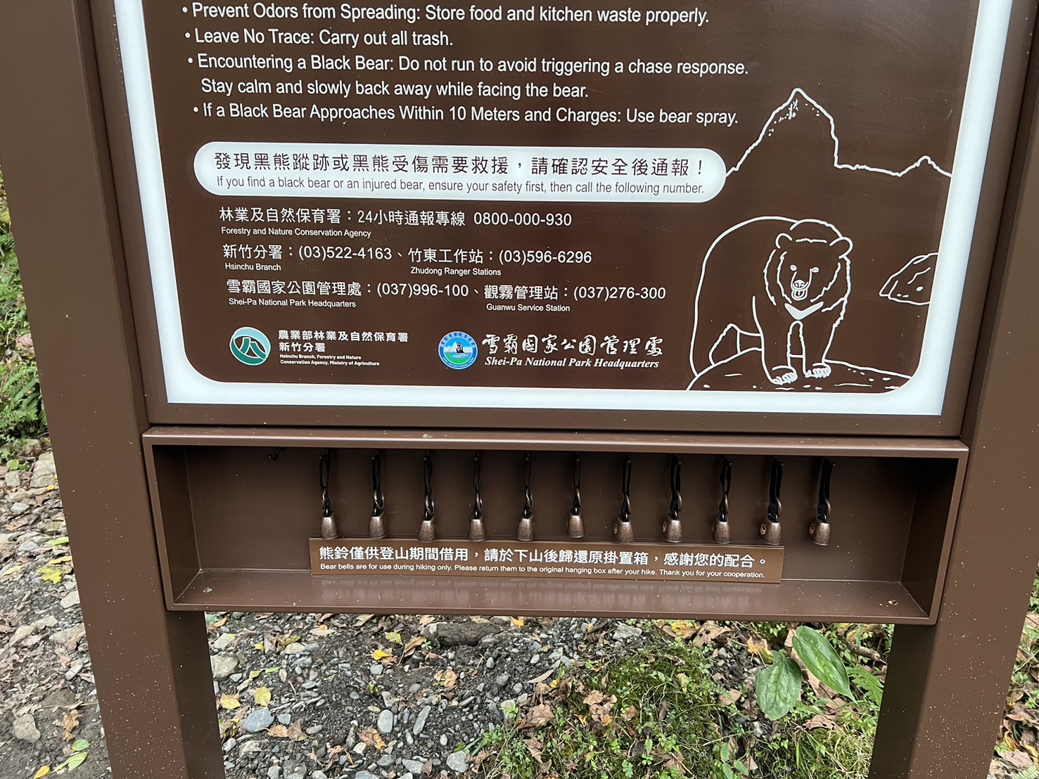 注意熊出沒告示牌外觀以大霸尖山意象為視覺主軸,並掛置大型熊鈴,兼具強化警示及保育宣導效果。牌面除介紹臺灣黑熊活動痕跡外,也提醒民眾在山區活動應提高警覺,應妥善收存食物及廚餘,避免吸引黑熊靠近。告示牌下方為熊鈴掛置箱,提供山友借用與歸還,山友在上攀大小霸前可於15k處或19k處取用,下山後歸還原放置箱即可。熊鈴的佩帶可讓山友在行進間製造聲響,以降低遭遇臺灣黑熊的可能性。