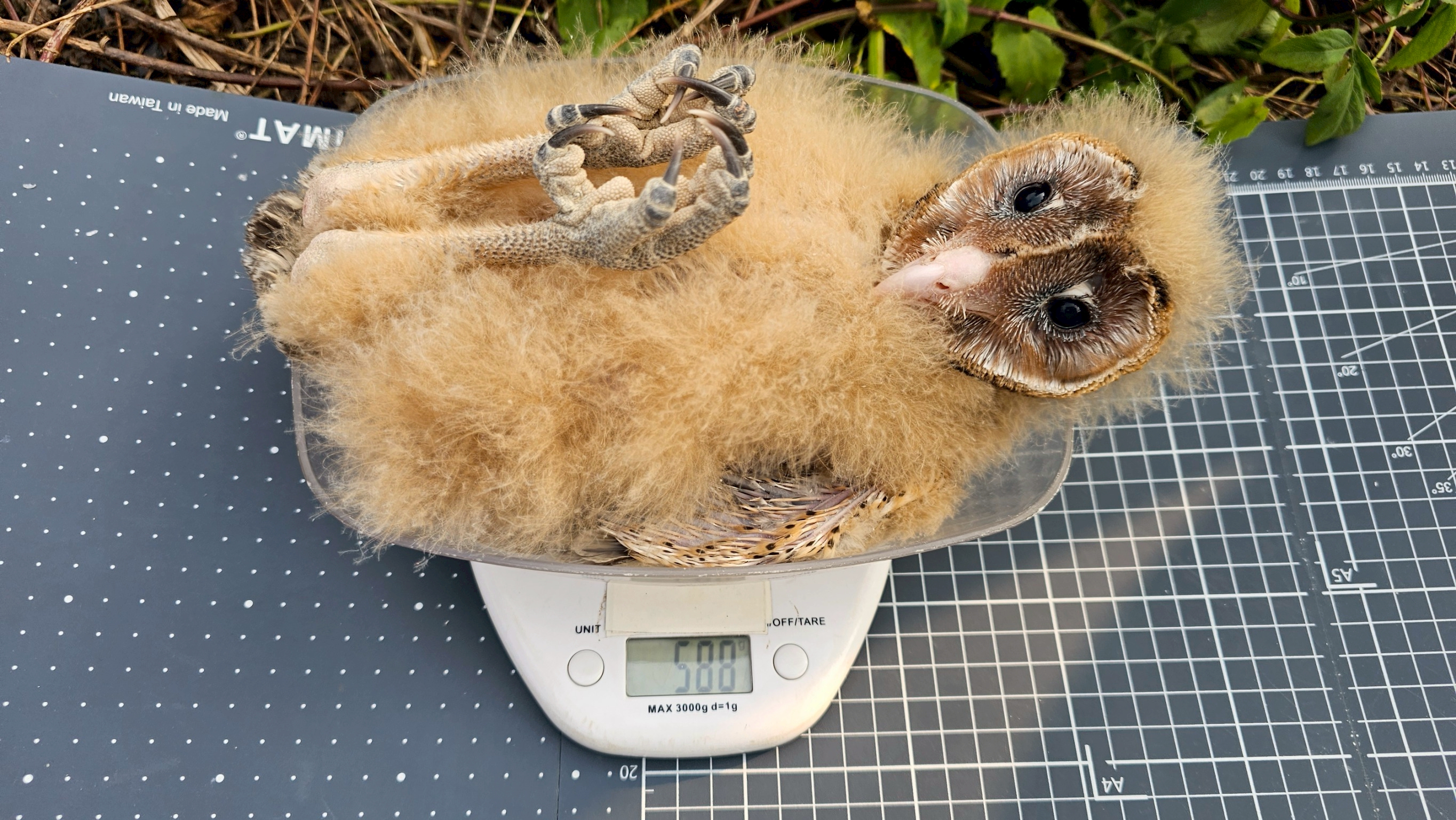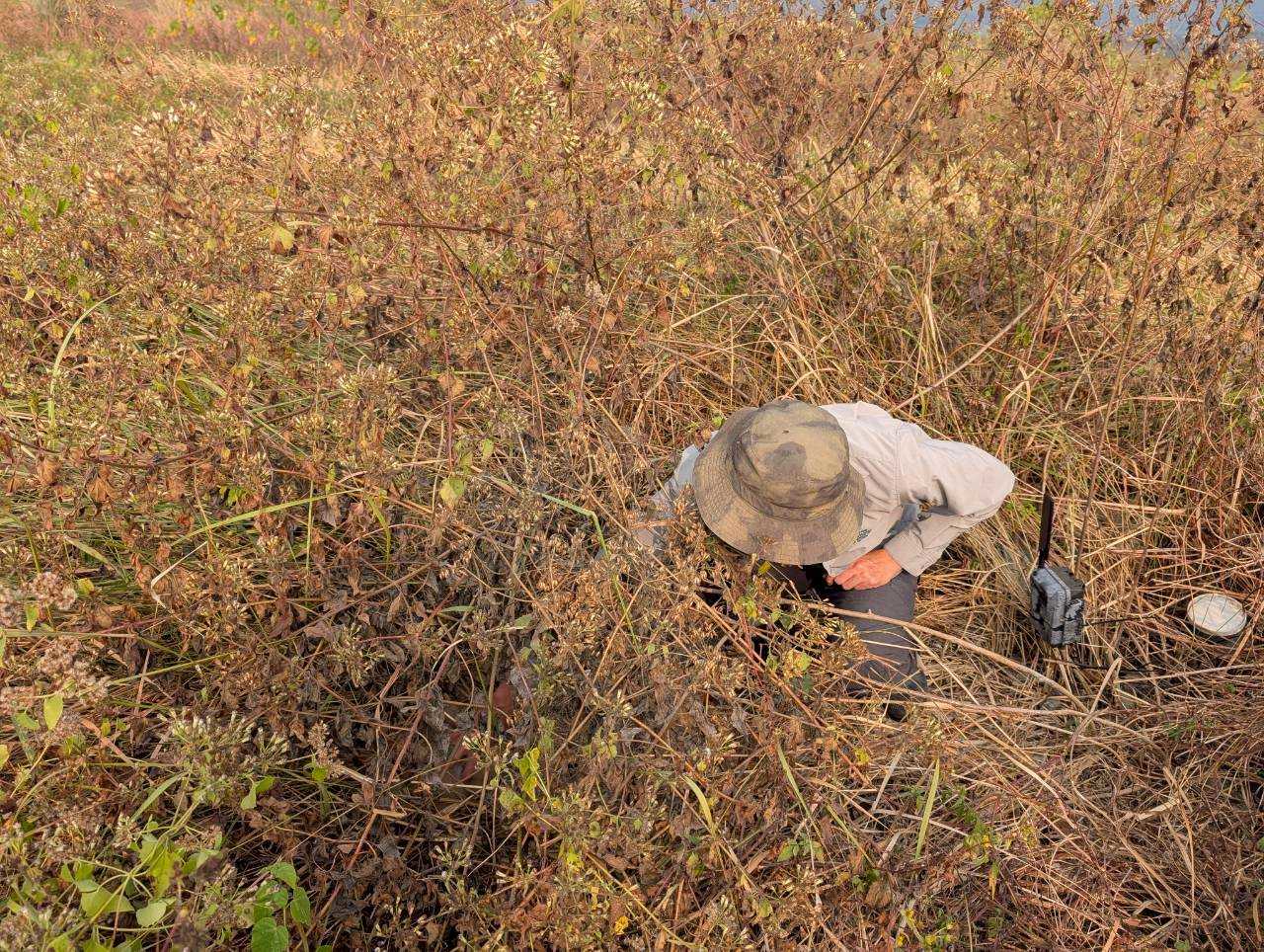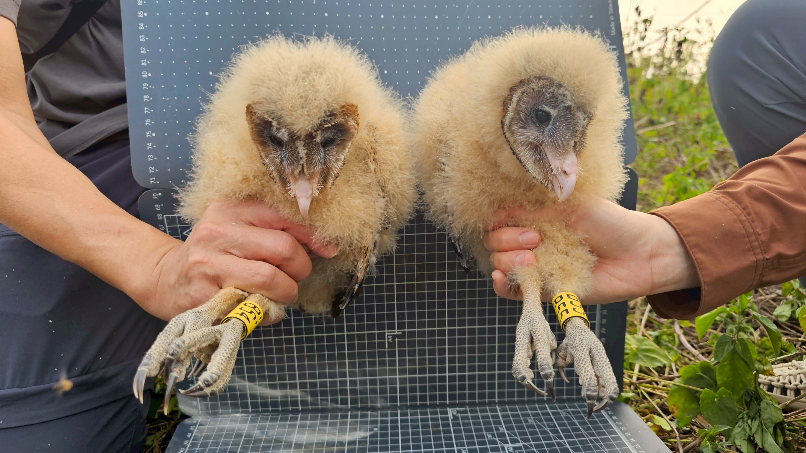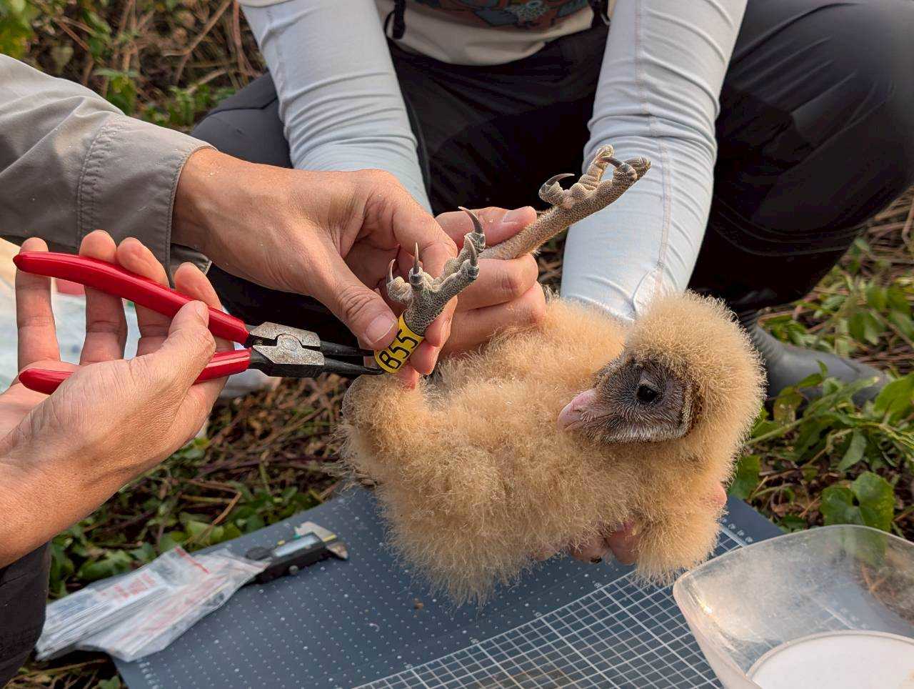 被稱為「猴面鷹」的草鴞,是臺灣唯一在草地上築巢的貓頭鷹,過去繁殖紀錄多集中在高屏溪流域,然而本次在林邊溪流域發現的巢位並非典型的白茅優勢草地,親鳥在一片以外來種植物香澤蘭為主的草生地中,巧妙利用零星的白茅草叢構築成新生命的搖籃。為了記錄這難得的繁殖過程,研究團隊透過架設4G自動相機進行遠端監測,完整記錄幼鳥成長的珍貴影像,並在幼鳥滿月之際,進行型質測量、健康檢查與上腳環作業。這些工作如同為幼鳥核發「身分證」,讓研究團隊能持續追蹤其離巢後的生存狀況,進而掌握高屏地區草鴞的族群動態。