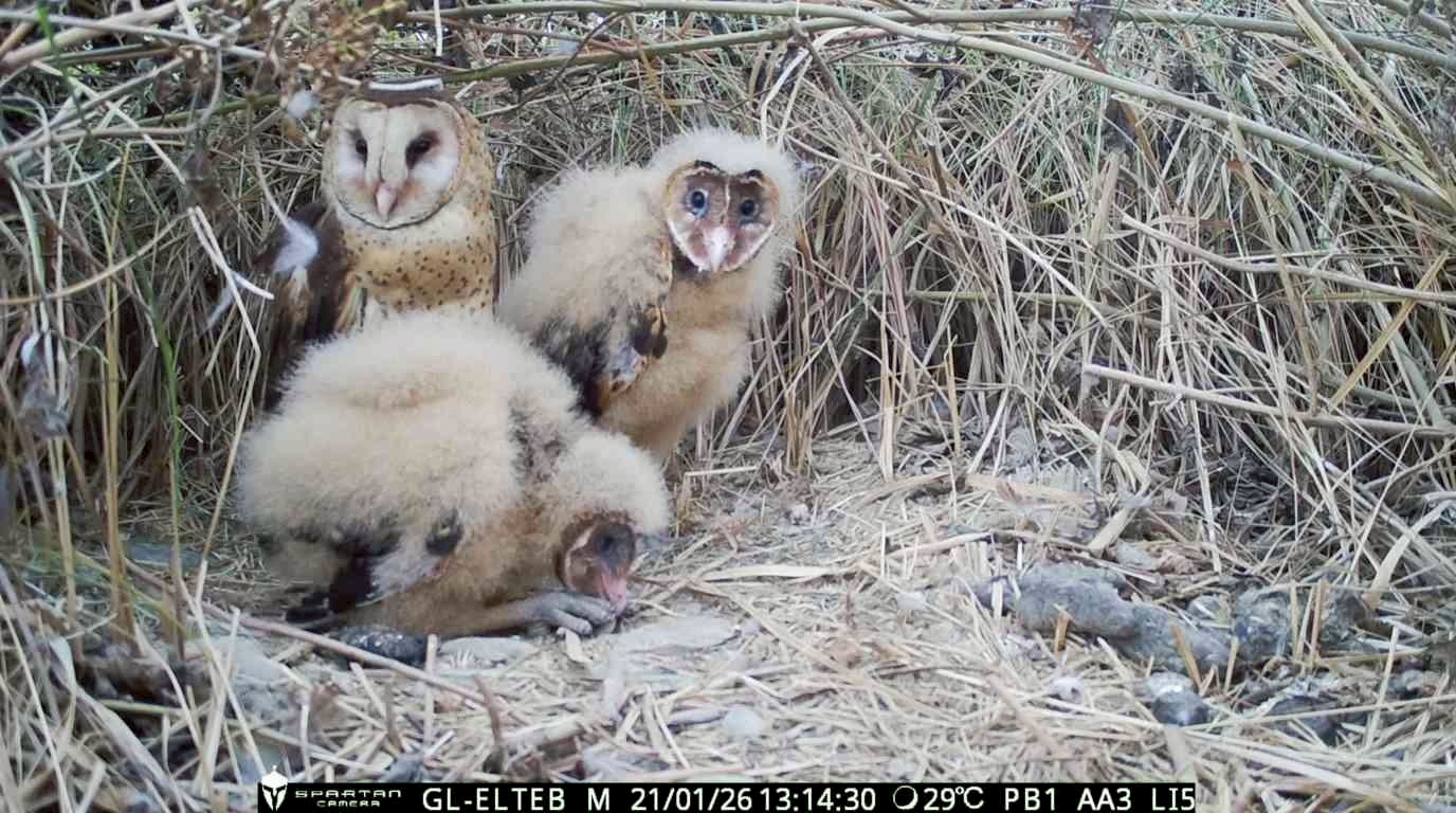 在冬季枯黃的草生地上,身披淺棕色絨毛的草鴞幼鳥完美融入這片地景之中,若非親鳥從草叢中飛起,這神祕的身影極難被察覺。林業及自然保育署屏東分署委託國立屏東科技大學野生動物保育研究所洪孝宇助理教授,執行高屏地區草鴞保育工作,長期追蹤草鴞族群動態。近日在林邊溪流域觀測到珍貴紀錄,一隻身上還有黃褐羽色的草鴞亞成雌鳥,在草生地築巢並成功繁殖育雛。這不僅是目前已知台灣最南端的繁殖觀測案例,更展現了草鴞在棲地選擇與生命週期上的強大適應力。