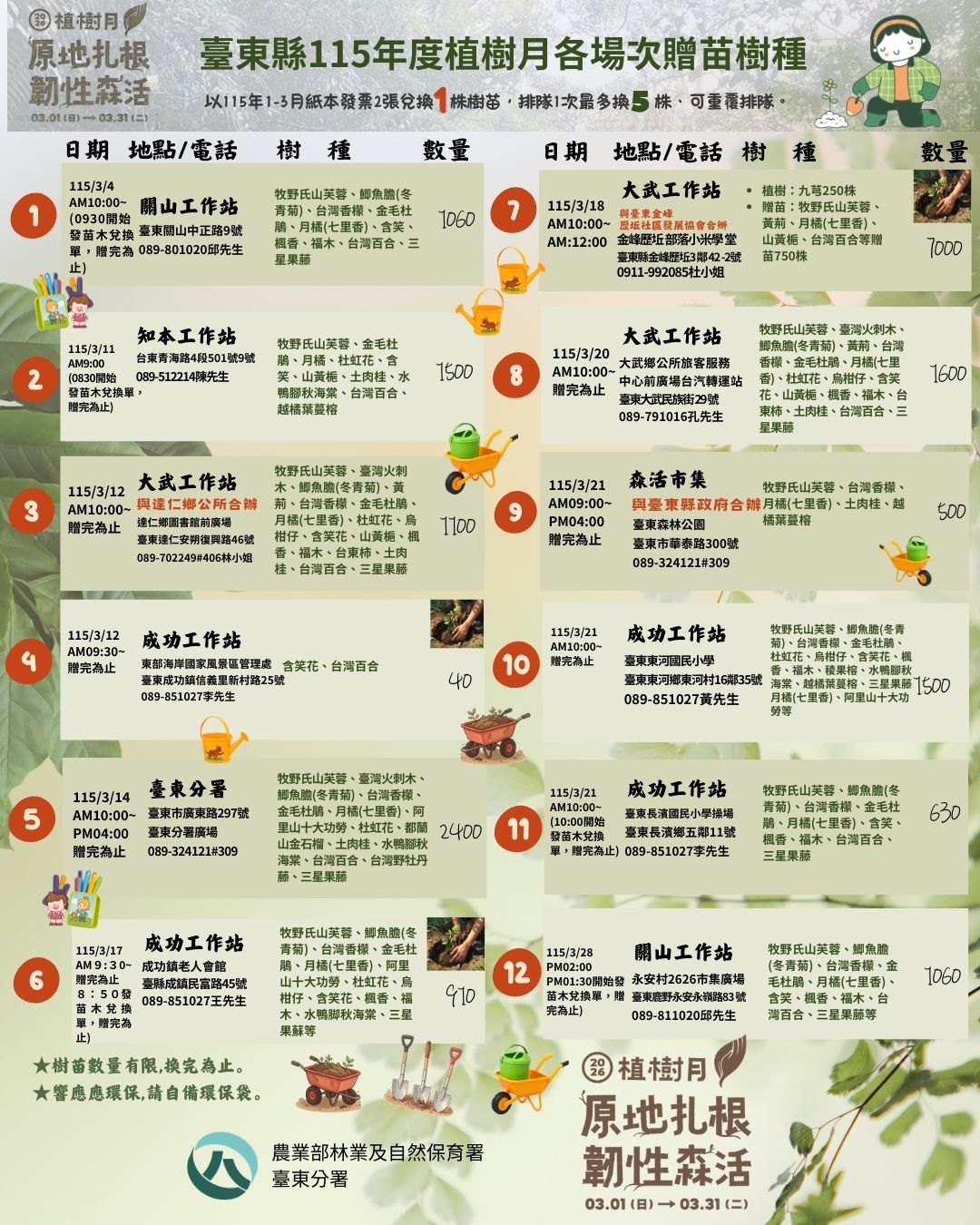 今年度臺東分署及轄下各工作站共舉辦14場次的贈苗活動,地點涵蓋臺東縣關山、知本、達仁、成功、金峰(歷坵村)、大武、東河、長濱及綠島等鄉鎮;臺東分署亦特別規劃於知本國家森林遊樂區、東部海岸國家風景區管理處、臺東森林公園及鹿野2626市集等辦理植樹及贈苗活動。活動場次多於上午開始,建議民眾可參考分署特別製作的場次圖卡資訊,先確認具體日期、時間及兌換方式,或連繫臺東分署及轄下各工作站確認,也可關注追蹤該分署官方臉書粉絲專頁(https://reurl.cc/bN1Y63)的公告。