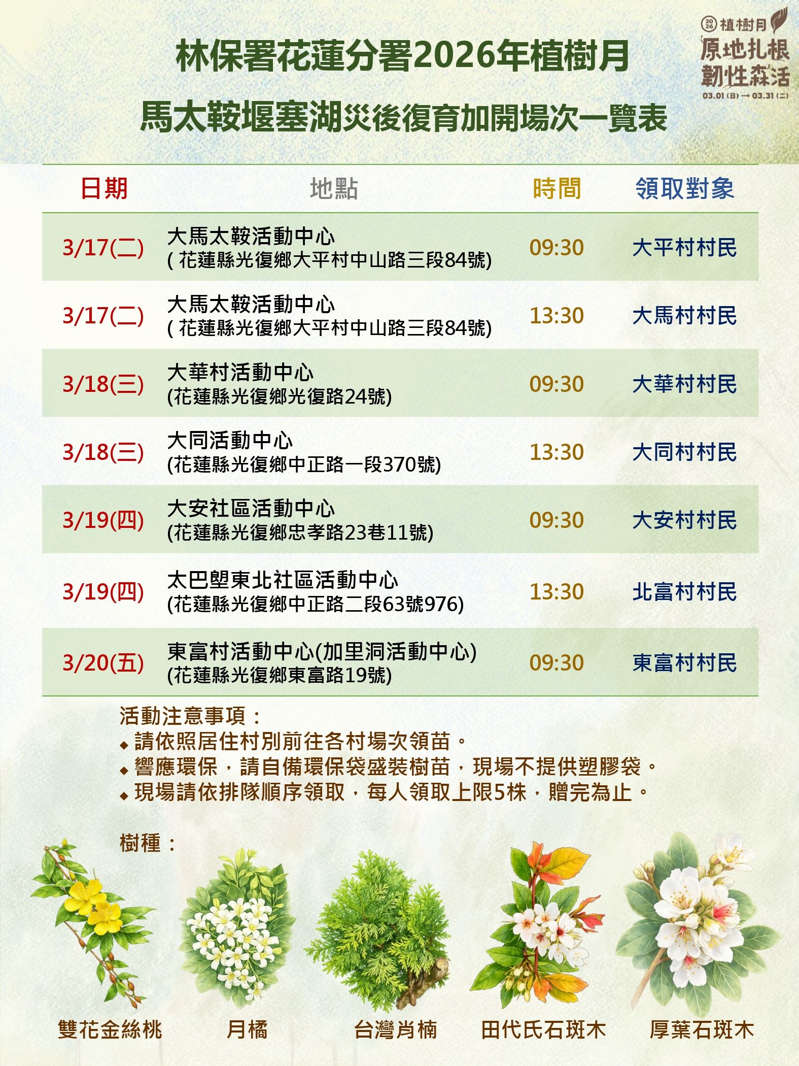 隨著春意漸濃,林業及自然保育署花蓮分署準備好迎接一年一度的綠色慶典,115年植樹月系列活動3月起正式啟動。今年以「原地扎根‧韌性森活」為活動精神,除了全縣由北至南共24場次的贈苗盛會外,最具指標性的區域植樹大場將於3月14日(星期六)上午9時20分,在國立花蓮高級農業職業學校畜牧場熱鬧舉行。同時,針對去年受馬太鞍溪堰塞湖影響而致災的光復鄉,分署特別安排7場次的贈苗活動,以綠色能量撫慰受災鄉民,協助重整美麗家園。 花蓮分署表示,有別於往年,除延續與花蓮縣政府自民國99年以來合辦區域植樹活動以外,今年首次以「產學深度融合」與「精準社區關懷」為雙主軸,14日當天將與花蓮高農正式簽署合作備忘錄(MOU),宣誓成為永續林業戰略新夥伴,開創東部林業教育新篇章。雙方基於資源共享,規劃五年內落實人才培育、林下經濟示範、國產材應用實作及資源互惠等四大願景,將林業專業向下扎根,培育在地未來人才。 活動選定花蓮高農1.6公頃畜牧場為植樹基地,翻耕移除外來種銀膠菊,並栽植 5 年期相思樹、15 年期楓香及 30 年期台灣櫸等不同伐期經濟樹種。透過「從育苗到加工」的完整體驗,將森林轉化為實務教室,具體實踐國產材與林下經濟政策。 花蓮分署特別說明另一主軸精準社區關懷,是為加速復建去年堰塞湖致災最嚴重的光復鄉,將陸續在鄉境內舉辦7場次贈苗活動,提供具景觀及生態價值的原生苗木,協助鄉親重整家園美學,只要是光復鄉民,無需發票即可免費領苗。透過植樹的生命力,美化災損環境,更為社區注入重生的希望與韌性,將植樹行動轉化為溫暖的社會支持能量,將公部門的關懷送到最需要的災民手中。 花蓮分署指出,區域植樹活動不只植樹及贈苗,也是一場多采多姿的市集盛宴。今年30個攤位涵蓋國產材應用、國土綠網保育成果、林下經濟推廣以及花蓮高農森林科的教學展示。亮點包括「森林經營實作區」,民眾可以體驗模擬人工林的「疏伐」操作,理解森林需要陽光與適度修剪才能健康的奧秘。在「部落工藝區」,將展現太魯閣族傳統織布與銅門小達刀的精湛技藝,並展示如何將疏伐剩餘料轉化為高品質精油,實踐循環經濟。在「在地風味區」,結合部落智慧推出的紅藜加工品、原民馬告科麵包及竹筒飯,讓參與者從舌尖感受與自然共生的純粹美好。 分署還邀請近期竄紅的療癒系樂團-「Nina & John 那就醬樂團」及「依錚依靜樂團」現場演出,用聽覺釋放生活壓力。前者由排灣族主唱Nina與來自美國西雅圖吉他手John組成的原創組合,音樂風格融合了爵士、放克與搖滾,歌詞中充滿了對東海岸山海氣勢的讚頌,將帶給現場民眾一場磅礴的視聽感受。還有依錚依靜樂團,音樂靈感多源自自然與生活感,以純淨、療癒的民謠風格著稱,擅長以音樂書寫生命。歡迎在分署精心安排的森林場域及大自然的天幕下,聆聽自然與曠野的心靈共鳴。 植樹月期間民眾詢問度最高的贈苗活動也有新亮彩。為了讓「韌性森活」不只是一句口號,分署精選10種具備高度適應力的原生苗木供民眾領取。在居家綠籬與防護選擇上,提供耐旱耐鹽的厚葉石斑木與田代氏石斑木,後者紅褐色的新葉不僅吸睛,更具備誘鳥功能;若希望增添家園芬芳,山黃梔的清雅香氣是最佳選擇;針對需要美化且忌積水的環境,則推薦具備優雅傘形樹冠與灰白色葉片的蘄艾(芙蓉)。此外,還有能吸引昆蟲授粉的蜜源植物雙花金絲桃,以及極具經濟與造景價值的長青喬木台灣肖楠。 牛樟樹姿雄偉、葉具樟香,適合做為庭園或行道綠蔭樹;楓香秋冬葉色轉橘紅,為營造季節景觀的亮點;月橘枝葉光亮、花香濃郁且耐修剪,是綠籬與造型綠雕的理想選擇;而越橘葉蔓榕為榕屬木質藤本,匍匐覆地或垂掛生長,覆蓋性佳,適用於坡地水土保持、植生牆與綠地造景,其深紅色果實亦具誘鳥與觀賞價值。從高大喬木到地被植物層次分明,十種苗木全面兼顧生態功能、景觀美學與環境適應力,讓民眾在不同空間條件下,都能打造兼具韌性與綠意的生活環境。 民眾只需捐出今年1至3月發票3張,即可兌換1株原生種樹苗,所有發票將捐贈公益使用。分署也呼籲民眾多加利用官方臉書粉絲專頁進行線上預約,以分流領苗,共同落實低碳生活。 花蓮分署誠摯邀請鄉親3月份一同加入植樹月活動,為花蓮種下韌性未來,讓森林與生活共好。各場次詳細資訊,可上花蓮分署官網及臉書粉絲頁查詢。