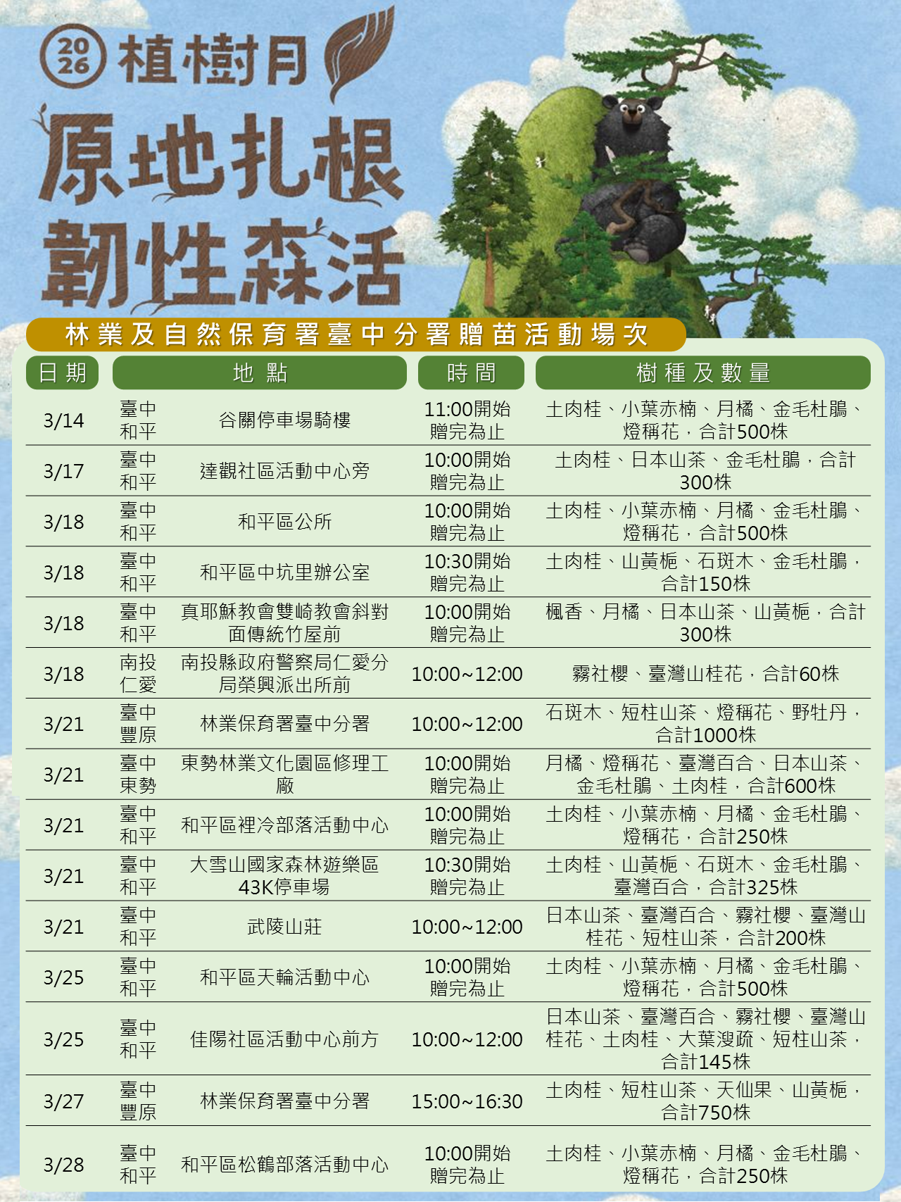 響應3月植樹月,林業及自然保育署臺中分署規劃28場次贈苗活動,為提供更便利、多元的服務,將於115年3月14日推出線上預約領苗服務,透過數位平台開放民眾領取臺灣原生樹種苗木。活動限量提供黃荊150株、樟葉槭150株及大葉溲疏100株,鼓勵民眾透過線上方式預約領苗,將原生植物栽植於生活周邊環境,打造綠意盎然的居家與社區空間。 林業保育署臺中分署表示,這次預約贈送的三種樹種皆為臺灣原生植物,不僅適應在地氣候,也具有良好的生態價值。其中,黃荊為落葉灌木,夏季會開出紫色小花,具有耐風、耐旱及耐貧瘠等特性,即使在公寓陽台也能種植,植株還帶有淡淡香氣,可作為香氣植物或中藥材使用;樟葉槭為臺灣特有種常綠喬木,樹形優美、冬季不落葉,果實為翅果,兼具觀賞價值與水土保持潛力;大葉溲疏則在春夏季盛開白花,常作為庭園景觀植物。 為了讓平日忙於工作的上班族也能輕鬆參與植樹行動,這次領苗活動採線上預約制,民眾可於3月14日中午12時起至3月20日中午12時止,至「ACCUPASS 活動通」網站完成預約登記(https://www.accupass.com/go/20260321tree),每人每種樹苗限領1 株(額滿為止)。預約成功者請於 3月21日下午1時至3時,前往營林所臺中出張所宿泊所(臺中市豐原區南陽路 488 巷 69 號)領取苗木。 林業保育署臺中分署指出,原生植物適應在地環境能力佳,也能提供蜜源及作為蝴蝶幼蟲食草,對營造友善生態環境具有重要意義。希望透過贈苗活動,鼓勵民眾在生活周邊栽植原生樹種,共同為生態保育與環境綠美化努力。此外提醒,請民眾自備環保袋領取苗木。植樹月期間,臺中地區還有15場次贈苗活動開放民眾現場排隊領取,相關活動時間、地點及苗木種類等資訊,可至林業及自然保育署臺中分署官網「最新消息」專區查詢。