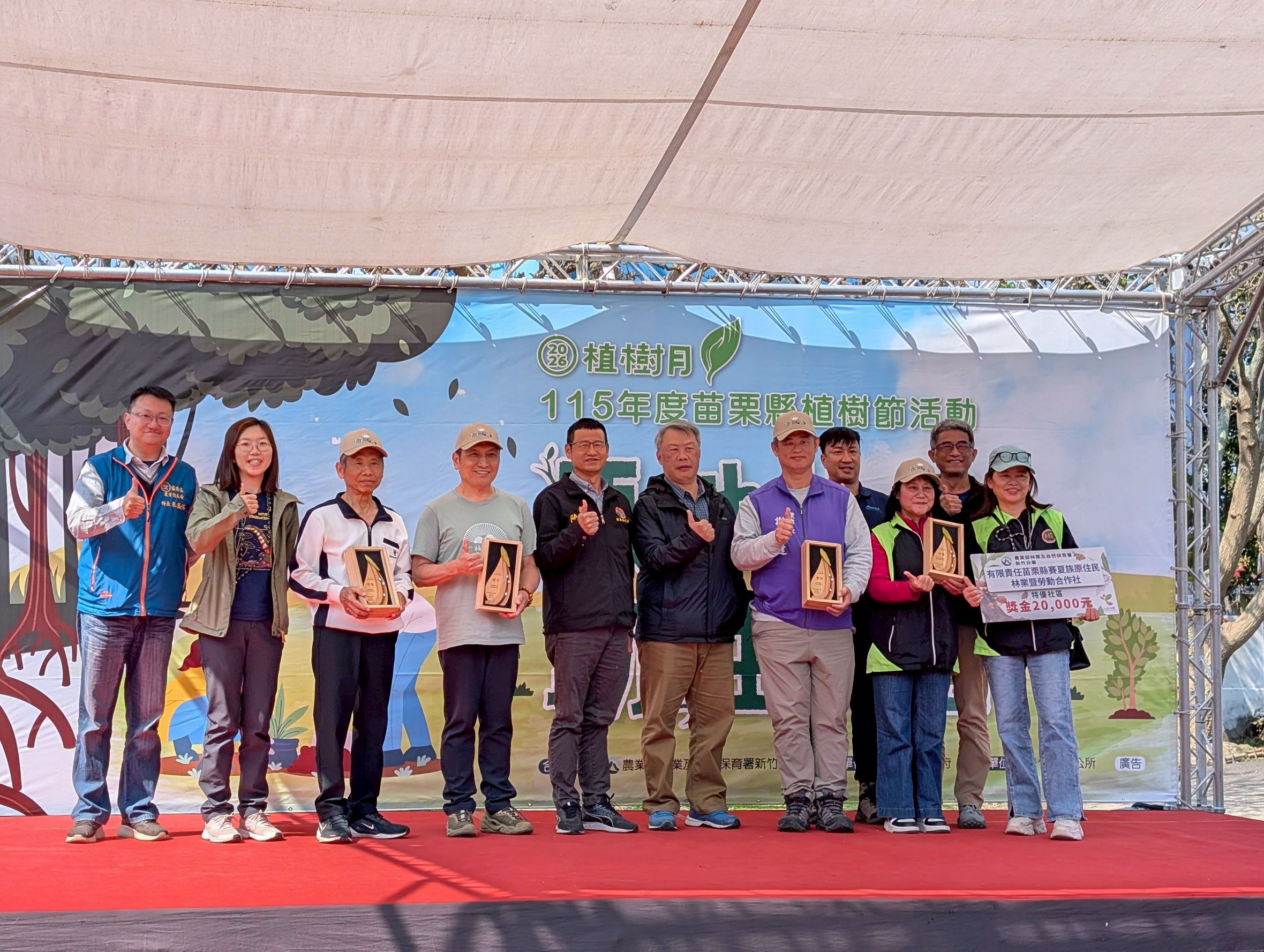 今(14)日林業及自然保育署新竹分署與苗栗縣政府合作,響應植樹月標語「原地扎根,韌性森活」,由苗栗縣鍾東錦縣長、林業保育署新竹分署林如森副分署長、苗栗縣竹南鎮方進興鎮長等貴賓與會。鍾縣長致詞時特別強調,官義渡自然公園位於中港溪出海口,擁有珍貴的紅樹林與濕地生態,在此植樹不僅象徵為土地扎根,更是強化環境韌性、為下一代種下希望的具體行動。 今日活動,由縣府頒發苗栗縣綠化有功人士及團體,新竹分署也頒發參與114年度「社區林業」計畫成果優異的苗栗地區績優社區,展現公私協力守護山林的豐碩成果。鍾縣長對獲獎單位表達高度敬意與感謝,認為這些基層夥伴是讓苗栗成為幸福宜居城市的關鍵力量,榮獲「特優」的「苗栗縣賽夏族原住民林業暨勞動合作社」,自108年組織「南庄森力軍」巡守隊,守護加里山傳統領域,114年更建置森林小站通報系統,實踐部落與森林共榮願景。榮獲「優等」的「頭屋鄉明德社區發展協會」,成功品牌化林下經濟產品,並培訓觀察員利用科技記錄到一級保育類食蛇龜蹤跡,將里山精神落實於生活;同獲「優等」的「樂活通霄休閒農業發展協會」則深耕森林療癒,培育專業療癒師並串連企業力量,建構健康療癒與經濟共榮的模式。獲頒「甲等」的「竹南鎮海口社區發展協會」,長期守護1311號保安林,透過紫斑蝶監測與民俗植物庫建置,將環境永續種子植入校園。今年獎牌特採國產材雕刻,融合雙手與綠葉意象,象徵社區團結守護環境,編織綠色未來。這些社區各具特色,不僅推廣生物多樣性,更達成人與自然和諧共存的永續目標,成為林業推廣的卓越典範。 新竹分署林如森副分署長指出,今年植樹月以「原地扎根.韌性森活」為核心,強調對土地的長久承諾。透過推廣原生鄉土樹種的適地適種,能有效營造苗栗「後龍溪流域」及「苗南丘陵淺山」兩大保育軸帶的優質棲地,為石虎、飯島氏銀鮈及大田鱉等珍貴在地物種打造安全的綠色廊道。此外,面對極端氣候挑戰,森林具備卓越的吸碳與調節功能,透過植樹行動不僅能提升環境韌性,更是邁向淨零永續的關鍵力量,期盼人與自然在變動中共同成長,展現生態修復的強大生命力。 為鼓勵鄉親落實綠網行動,現場發放由新竹分署提供的 2,000 株原生苗木,包括烏來杜鵑、小葉赤楠、短柱山茶及臺灣金絲桃等。鍾縣長親自呼籲鄉親踴躍領取,將綠意帶回家庭與社區,讓減碳生活在苗栗遍地開花。現場另設有淺山動物監測、永續林業等,透過「廉政拼拼樂」等趣味遊戲,向民眾推廣反詐騙、利益衝突迴避及消費者保護等法規。透過寓教於樂的互動,不僅深化民眾的防貪意識,更展現政府在推動生態永續之餘,攜手公私協力守護清廉社會的決心。等宣導攤位,透過豐富的互動遊戲與獎品,讓參與民眾在歡樂氣氛中,共同為苗栗織出專屬的綠色網絡。