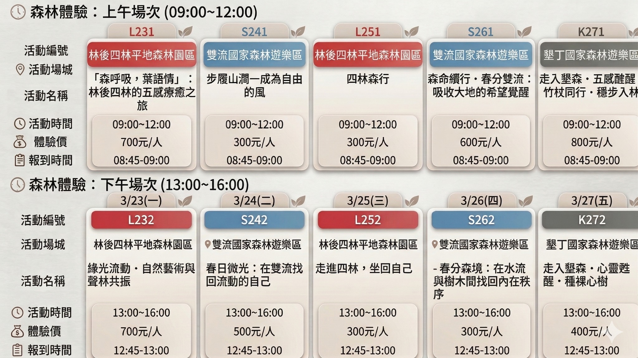 讓森林撫慰你的心!「森林療癒在高屏」成果展 3/19 療癒登場 30 位準療癒師「帶隊實習」開跑,春季森林處方箋同步開放報名 為守護國民健康並推動地方創生,林業及自然保育署屏東分署與國立屏東科技大學森林系攜手合作,投入高屏地區森林療癒人才培訓與場域盤點。經過嚴格的課程與考核,目前已有 30 位準森林療癒師進入最後的帶隊實習階段。屏東分署將於 2026 年 3 月 19 日(四)在林後四林平地森林園區舉辦成果發表會,並接續展開「春季森林處方箋」體驗週活動。報名期限自即日起至 2026 年 3 月20 日(五)止。 跨界種子帶隊:從心理師到原鄉工作者的專業守護 本次培育的 30 位準森林療癒師背景極為多元,涵蓋了國家森林志工、專業解說員、環境教育人員、原住民社區工作者、社工師、心理師、休閒農場主、教師及退休人員。 屏東分署表示,這群學員依照林業保育署森林療癒師認證體系要求,已完成大部分核心課程,正處於展現專業的「最後一哩路」。透過不同背景的專業視角,森林療癒將不再只是散步,而是結合心理與生態專業的深度身心修復。 3/19 成果展亮點:聽見森林與人的對話 成果發表會當天,將由李政賢分署長與協辦計畫的屏科大森林系羅凱安副教授共同主持。現場內容包含: • 準療癒師感言: 分享如何從各專業領域轉身投入自然療癒的心路歷程。 • 場域特色介紹: 深入解析高屏地區適合發展療癒的森林秘密基地。 • 體驗活動示範: 由準療癒師親自帶領,示範如何與森林環境互動。 期間限定!3/23-3/27「春季森林處方箋」體驗週 成果展後,這群準療癒師將於3月23至27日進駐林後四林、雙流、墾丁等三個森林育樂場域進行實習帶隊。這不僅是他們的結業練習,更是民眾難得的體驗機會。透過森林漫步與五感覺察,參與者能優先體驗森林對健康的正向效益。三個場域分別有: • 林後四林平地森林園區|主題:森之安頓 在平地森林的廣闊綠意中,透過五感療癒與呼吸練習,感受自然藝術與心靈的共振,找回內在秩序。 • 雙流國家森林遊樂區|主題:成為自由的風 善用園區純淨水系,推廣「溪流濯足」與感官步行,讓參與者在春日微光與潺潺水聲中,體驗如風般的自我流動。 • 墾丁國家森林遊樂區|主題:心靈甦醒 深入熱帶季風林的奇幻地景,透過「竹杖同行」與「種下心樹」的探索過程,達成深度的自我覺察與土地連結。 展望未來:從國家森林遊樂區擴散至部落與社區 屏東分署表示,未來森林療癒計畫將逐步由國家森林遊樂區延伸至社區森林與原鄉部落,結合在地資源與文化特色,達成健康促進與地方創生的雙贏局面。 📅 活動資訊 • 成果發表會: 2026 年 3 月 19 日(四)10:00 @ 林後四林平地森林園區 • 體驗週日期: 2026 年 3 月 23 日(一)至 3 月 27 日(五) • 地點: 林後四林、雙流、墾丁國家森林遊樂區 • 報名期限: 即日起至 2026 年 3 月20 日(五)止(名額有限,額滿為止) 報名https://forms.gle/qU9mo4u5fmQJYTgG7