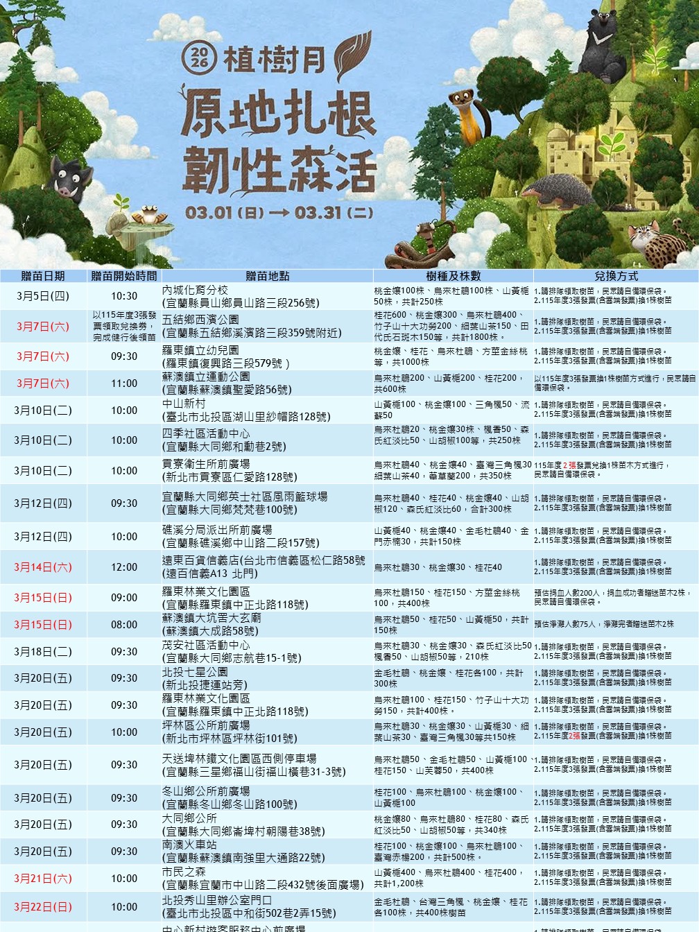 三月是植樹月,林業及自然保育署宜蘭分署邀請民眾響應115年植樹月「原地扎根 韌性森活」主題活動,推廣臺灣原生植物,今(115)年宜蘭分署將於3月5日啟動轄內各地區植樹及贈苗系列活動,預計有23場次,推廣發送烏來杜鵑、田代氏石斑木、桃金孃、山黃梔、金毛杜鵑、細葉山茶、竹子山十大功勞等多種樹苗,總計1萬餘株臺灣原生樹種苗木,歡迎民眾踴躍參與,一同建構國土生態綠色網絡,營造臺灣生態廊道,亦讓都市一起綠美化。 歡迎有興趣兌領苗木的鄉親朋友,憑115年3張發票(雲端發票亦可)換取臺灣原生樹苗1株,並請自備環保袋,所募集的愛心發票將於植樹月結束後,由林業保育署宜蘭分署統一捐贈予宜蘭縣社會福利聯合勸募基金會,以協助當地社福事業發展,歡迎鄉親共襄盛舉,植樹減碳愛地球,同時發揮愛心做公益。 林業保育署宜蘭分署提醒您,各場次贈苗活動苗木索取方式不同,請民眾就近領取苗木時,參考各場次須知事項。活動詳情請參閱「植樹月贈苗活動一覽表」(https://url.forest.gov.tw/115tree)(如有異動會以紅字標示,提醒您出發前務必再次確認資訊)或至林業及自然保育署宜蘭分署臉書專頁查詢。