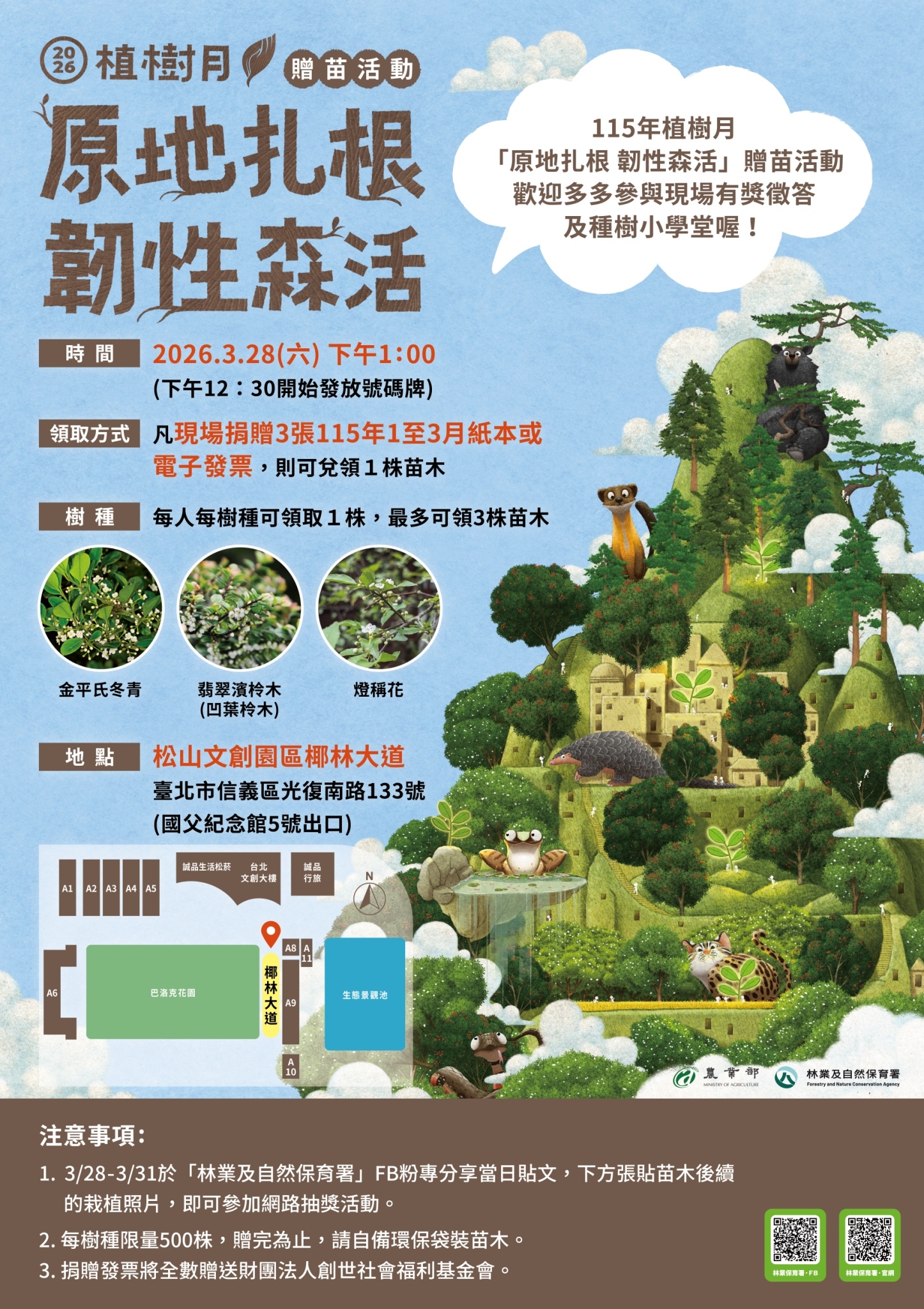 農業部林業保育署訂於3月28日在臺北松山文創園區椰林大道舉辦115年植樹月「原地扎根.韌性森活」贈苗活動,提供金平氏冬青、翡翠濱柃木(凹葉柃木)、燈稱花等3樹種共計1,500株提供民眾領取。領苗民眾需自備環保袋,以3張115年1至3月發票兌領1株苗木,每人每種苗木最多兌換1株,所募發票將全數捐贈財團法人創世社會福利基金會。活動自下午1時開始(12時30分開始發放號碼牌,贈苗時間最晚至下午4時,贈完為止)。 當天現場設有「種植小學堂」服務攤位,透過專業職人現場栽植解說,推廣原生植物景觀特色與生態價值,讓現場民眾體認原生植物對環境韌性的關鍵作用,同時也加強生物多樣性與風險調適力等觀念。在等候領苗過程,林業保育署也有有獎徵答活動,歡迎民眾踴躍參與,將有機會獲得臺灣原生樹種系列小禮物。領完苗的民眾也可以順道走一趟松山文創園區(台灣設計館03展間),參觀林業百年展「100Y山林有時:___」特展,體驗林業在臺灣的百年軌跡,引領國人一同思考我們與山林之間的未來。 林業保育署說明,贈苗活動主要是推廣臺灣原生植物,種下韌性未來,讓森林與生活共好。本次特別挑選具有韌性的樹種,也適合居家種植,創造更有綠意的居家生活。 活動詳情請參閱「植樹月贈苗活動一覽表」(https://url.forest.gov.tw/115tree)或至林業保育署臉書專頁查詢。 林業及自然保育署贈苗日期及活動地點:115年3月28日(星期六)下午1時於臺北松山文創園區椰林大道(臺北市信義區光復南路133號/誠品生活松菸對面)。