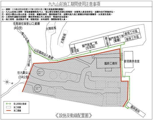 為提供山友更好的住宿環境,九九山莊將於115年3月30日施工整建,預計完工日期為117年12月31日,期間將進行分期分區施工,施工期間山莊營運不中斷,將保留70床位供往來山友住宿使用。 林業保育署新竹分署說明,第一階段施工範圍為龍門客棧一號、管理員室及餐廳,暫停開放;龍門客棧二號維持山友住宿功能;龍門客棧三號則為餐廳及廚房空間。請山友配合山莊管理員引導前往住宿區及辦公室進行報到。 第一階段整建完成後,山莊主要住宿及餐飲空間完備,即開放使用並調整動線,並進行第二階段施工工項,拆除龍門客棧二號及三號,同時整修全木構的龍門一號及拆遷鐵皮蒙古包至適切位置予以保留。 新竹分署表示,九九山莊修建工程除提升建築物結構強度、保暖性、舒適性外,透過山屋機能的集中,日後上山如遇天候不佳,山友將不再需要頻繁穿脫鞋撐傘往返於餐廳、廁所及各棟客棧之間,期提供山友更乾淨、便利的登山住宿環境。 新竹分署指出,相較於平地工程,高山地區施工條件極為嚴苛且具挑戰性,物資運補與人力調度不易,工程推動實屬艱困,懇請山友務必珍惜山區有限資源,於修建期間配合各項住宿與動線安排,並依循山莊管理員的引導。另請於規劃行程時務必留意名額變動,提早完成入園申請,共同維護良好的登山環境。 另為保存九九山莊這60年多年來珍貴的歷史記憶,邀請各界山友翻開舊相冊,找出與大霸尖山登山路線及九九山莊相關的老照片,並簡短說明照片背後的故事,林業保育署將從中挑選出25張優選照片,於新九九山莊餐廳或交誼室等適切空間進行展示,並透過相關網站、影片的記錄,讓這些記憶與故事,能夠一代又一代的傳承下去!FB老照片徵集貼文及活動參與方式如下: https://www.facebook.com/share/p/1KQLrt5htC/