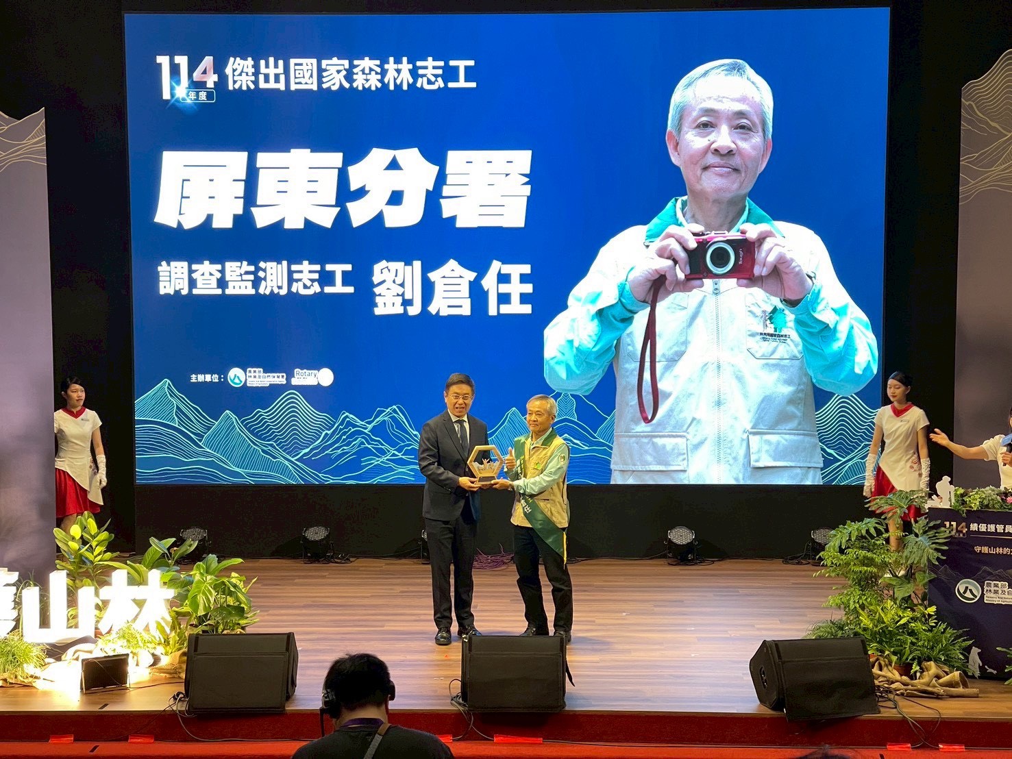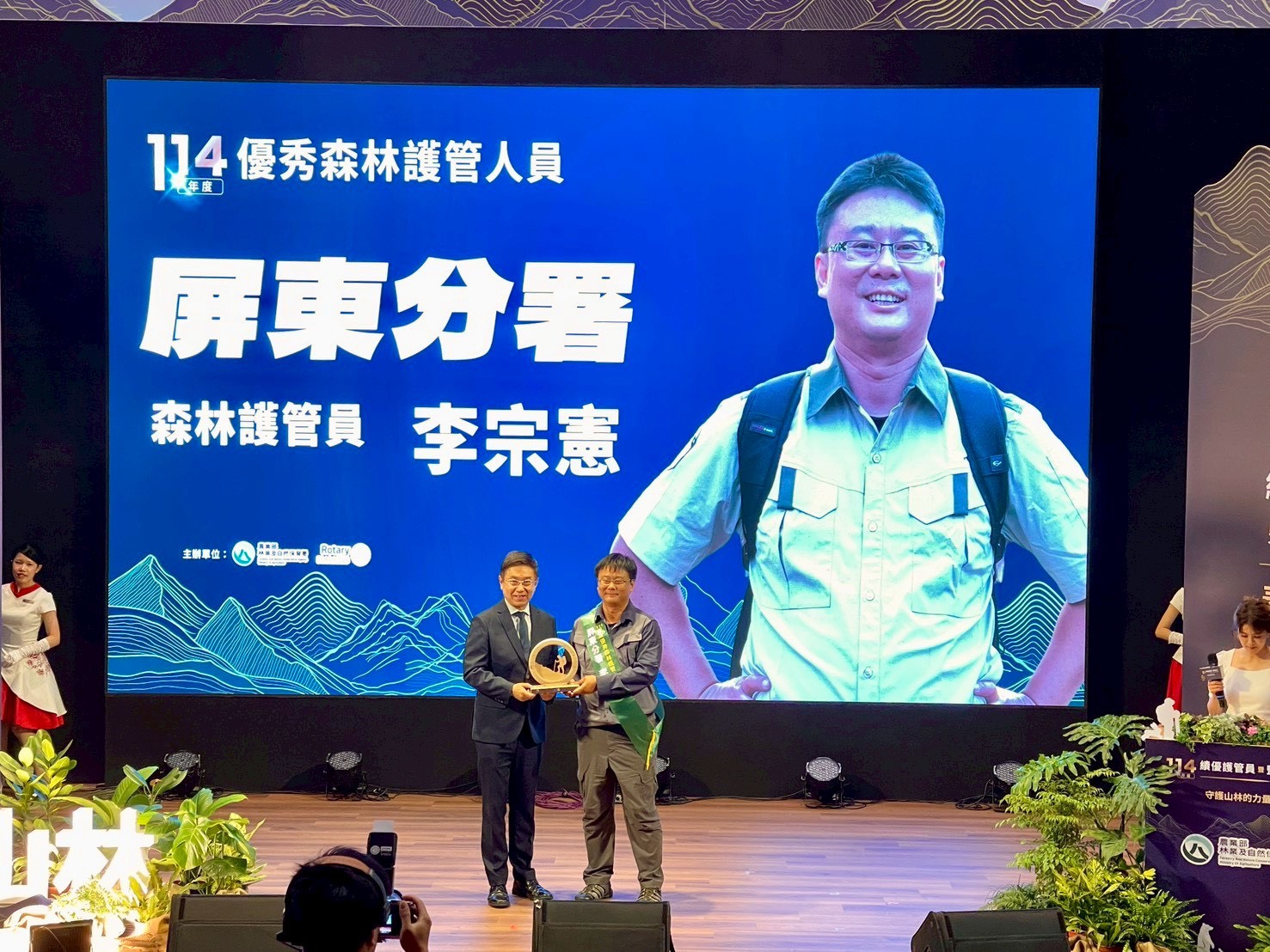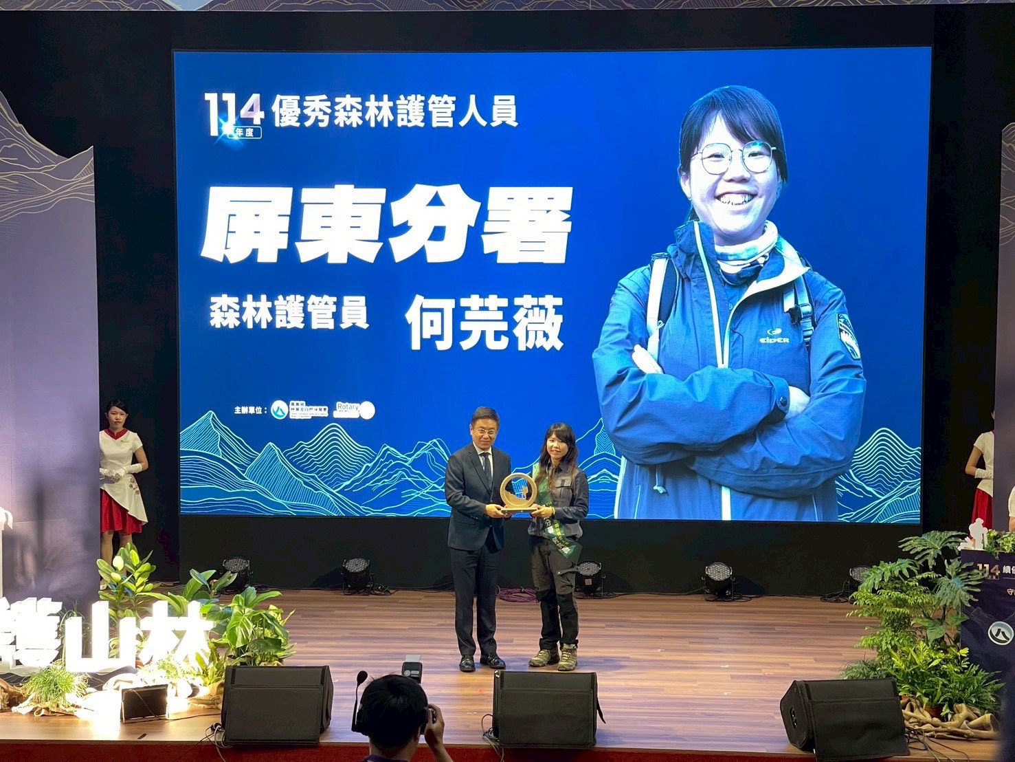 林業及自然保育署昨(20)日舉行年度表揚活動,表彰守護山林的第一線人員。屏東分署今年共有3人獲獎,包括森林護管員何芫薇、李宗憲及國家森林監測志工劉倉任,分別在巡護管理、防火救災與生態監測等領域展現卓越表現,成為守護臺灣森林的重要典範。