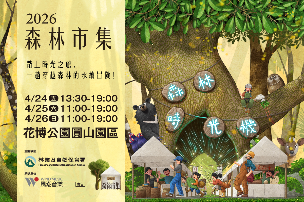 由林業及自然保育署主辦,全臺規模最大、最具山林教育體驗價值的「森林市集」,於 24 日(五)至 26 日(日)在臺北圓山花博公園入口廣場、環形廣場及花海廣場盛大登場,每年吸引上萬人。邁入第九屆的森林市集,今年集結超過 50 家品牌業者,帶來多元創意國產材木、竹精品及森林氣味與林下經濟好物,呈現森林資源轉化為當代生活的永續選擇。現場規劃音樂演出、親子互動舞台、木育體驗展、DIY 手作及戶外裝置藝術,讓民眾在沉浸式體驗中,感受森林永續利用的價值。 2026森林市集今年以「森林時光機」為主題,透過表演、互動展覽、DIY 工作坊與闖關遊戲,帶領民眾穿梭不同時空下的森林故事。市集展區規劃「山林製造」、「森鄰良品」、「永續森活」、「寓木於樂」四大主題,從生活選品、設計工藝到林下經濟應用,精選上百項優質臺灣木竹商品,展現森林資源透過創意轉化走入日常,成為最有溫度的生活提案。 林業保育署今年也推出呼應主題的特色體驗活動,民眾完成指定任務,即可現場製作「雨聲筒 × 森音時光機」,模擬雨滴落在大地上的天籟,將森林的聲音饗宴收藏於手作之中。此外,全新登場的「木育體驗展」,結合大溪工藝之城「BUBU 跳恰恰」木飛車互動體驗,讓民眾親身參與將木育知識轉化為具體互動體驗,拉近人與森林的距離。 三天活動期間,也邀請金曲得主戴曉君、泥灘地浪人、JOYCE 就以斯、無賴叔叔藍調搖擺樂隊及印度文化工作室,帶來豐富多元音樂盛宴;並安排微笑姐姐森林故事屋與陳為伶 Ali 團隊森林劇場與親子同樂,讓不同年齡層皆能在森林律動中找到專屬節奏。 每年備受期待、場場額滿的 DIY 工作坊,今年也持續與市集品牌合作推出 13 場精選體驗,引領民眾透過指尖感受森林材料的溫度與香氣。2026 森林市集「森林時光機」將於 4 月 24 日(五)13:30 至 19:00,以及 4 月 25 日(六)至 4 月 26 日(日)每日 11:00 至 19:00 舉辦。|2026森林市集【森林時光機】活動資訊|活動地點:臺北圓山花博公園入口廣場、環形廣場、花海廣場(臺北市中山區玉門街1號)|活動時間: 04/24(週五)13:30–19:00 04/25(週六)11:00–19:00 04/26(週日)11:00–19:00|林業及自然保育署臉書:facebook.com/FANCA.Taiwan|森林市集臉書:facebook.com/2021forest|森林市集活動網站:https://portaly.cc/forest