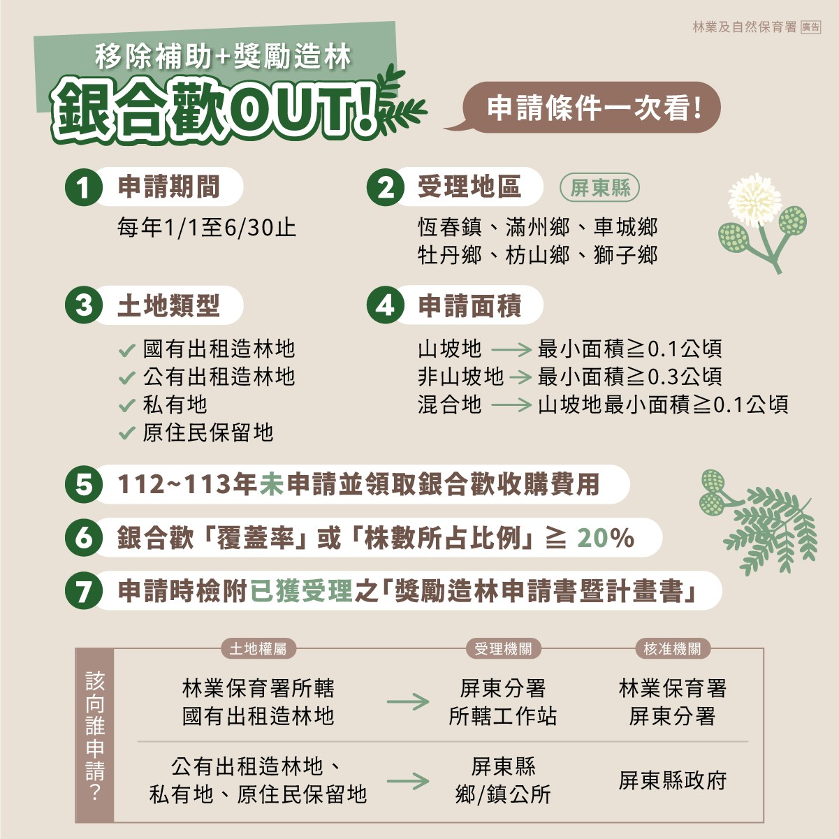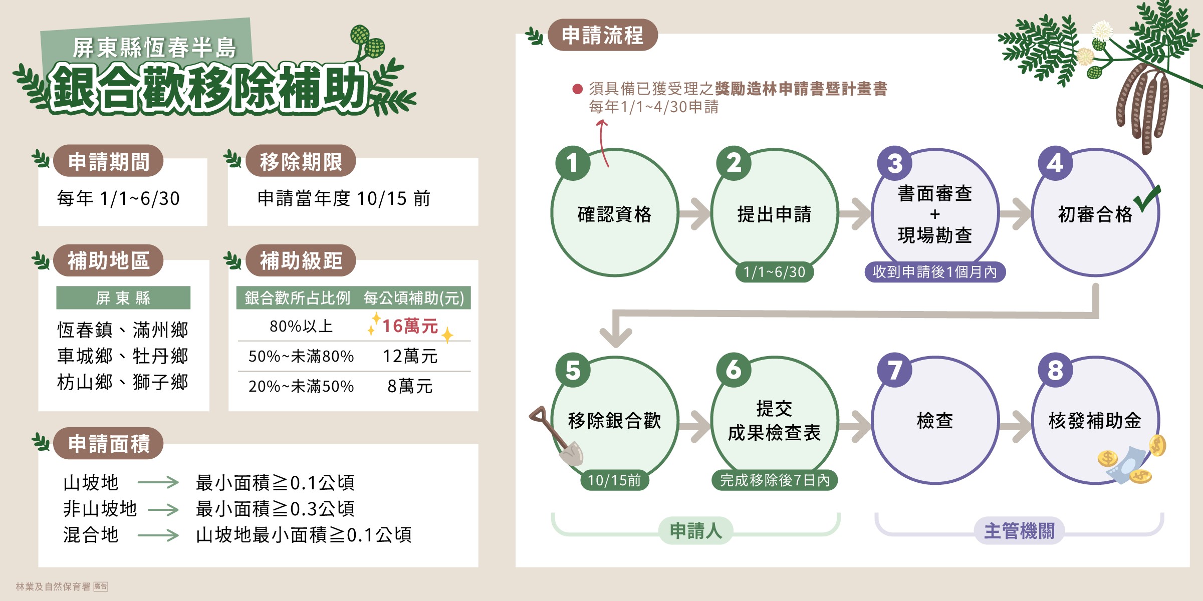 為持續防治強勢外來入侵種—銀合歡,農業部林業及自然保育署於今日發布「屏東縣恆春半島銀合歡移除補助作業要點」,針對恆春半島地區私有土地提供移除補助,鼓勵土地所有權人或承租人積極移除銀合歡,並銜接獎勵造林政策重新植林。移除補助銜接獎勵造林,提升生態復育成效銀合歡繁殖能力極強,於恆春半島成為強勢入侵種,導致其它原生植物生長不易。林業保育署希望透過這項補助機制鼓勵民間持續參與銀合歡移除,並於移除後配合造林復育,以避免銀合歡再度萌發,確保防治成效。本要點補助範圍為屏東縣恆春鎮、滿州鄉、車城鄉、牡丹鄉、枋山鄉及獅子鄉等恆春半島地區,遭銀合歡入侵占比達20%以上之私有土地、原住民保留地,或國、公有土地出租造林地,惟112至113年間已領取林業保育署銀合歡收購費用者,則不能重複領取此項補助。分級補助,依入侵占比核發每公頃最高16萬元林業保育署指出,要點依銀合歡覆蓋率或株數所占比例分級補助如下:●達80%以上者,每公頃補助16萬元●50%以上未滿80%,每公頃補助12萬元●20%以上未滿50%,每公頃補助8萬元此項補助至117年為止,為期3年,申請期間自每年1月1日至6月30日止。林業保育署經管之國有土地出租造林地,由林業保育署屏東分署所屬各工作站受理;公有土地出租造林地、私有土地及原住民保留地,則由申請區域所在地之鄉(鎮)公所受理。申請案件經初審合格後,申請人應於當年度10月15日前完成銀合歡移除;於115年及116年申請之案件,如因配合造林季節需要,得於當年度9月30日前申請展延,最遲可延至翌年4月30日前完成,兼顧作業彈性與實務需求。中央地方協力,打造恆春半島永續生態環境林業保育署表示,本要點由中央與地方合作推動「移除+造林復育」,希望能進一步減少恆春半島銀合歡覆蓋率,並恢復原生植群,打造更具多樣性的原生生態環境。